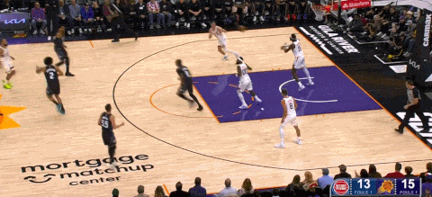 太阳在转换进攻中一贯采取两侧next的站位再发起一五掩护,吉莱斯皮落半场和马威掩护发起,随后马威快速顺下吸引中路奥萨的协防刷卡,阿伦顺势从左侧移动至弧顶接应命中三分。