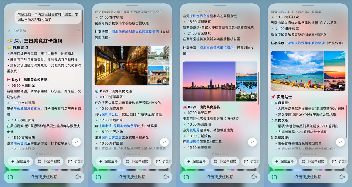 对吃货来说,旅行的头等大事就是规划“吃什么”。上回出门,我直接对着手机说:“帮我规划一个深圳三日美食打卡路线,要包括早茶、大排档和糖水。”没一会儿,一份图文并茂的美食“逛吃”攻略就新鲜出炉。从福田老字号早茶,到必打卡的糖水铺,小艺会结合餐厅和景区位置,为我推荐逛吃路线。按照小艺的清单走,居然比很多美食博主的推荐更nice。