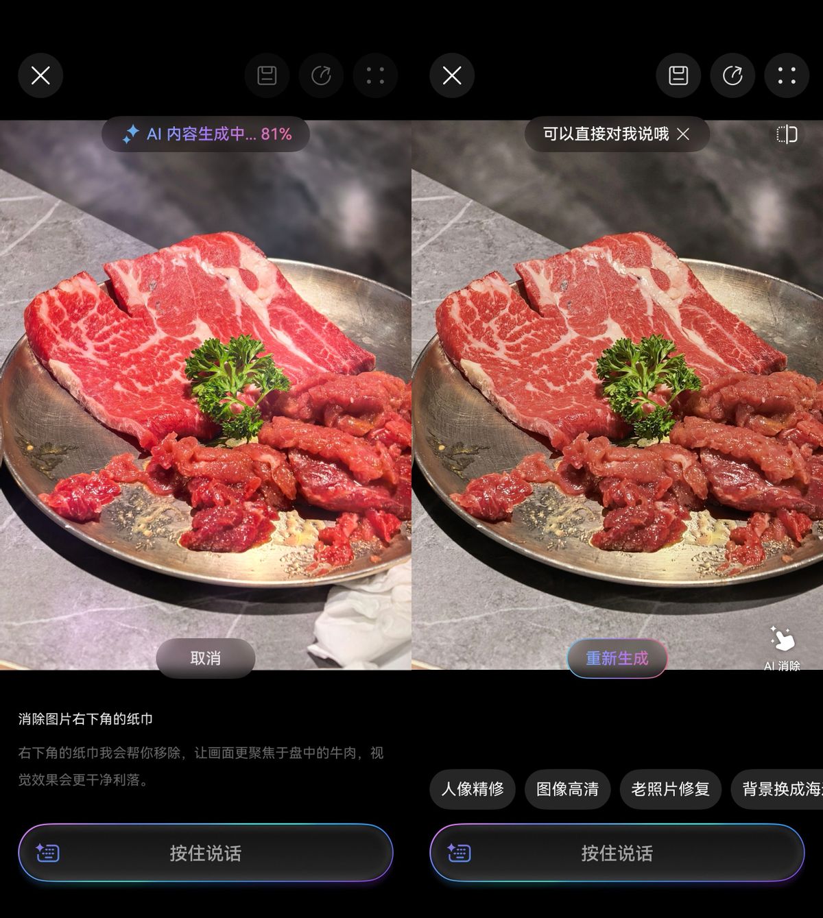 要是拍的美食照片有瑕疵,只要一句话就能修图。比如这盘牛肉旁边乱入了一张纸巾,我只要打开小艺修图智能体,一句“消除右下角的纸巾”,小艺就会快速将纸巾消除,效果十分自然。从此我的每道菜都像是有了“精修海报”,朋友圈点赞数翻倍。