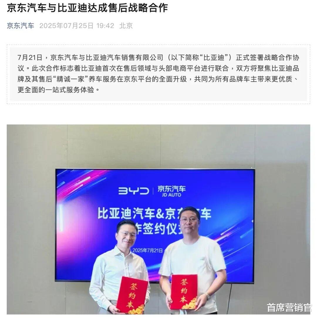 随后,京东又与比亚迪达成战略合作,开设官方售后旗舰店,将“原厂服务”通过京东的渠道网络提供给车主。