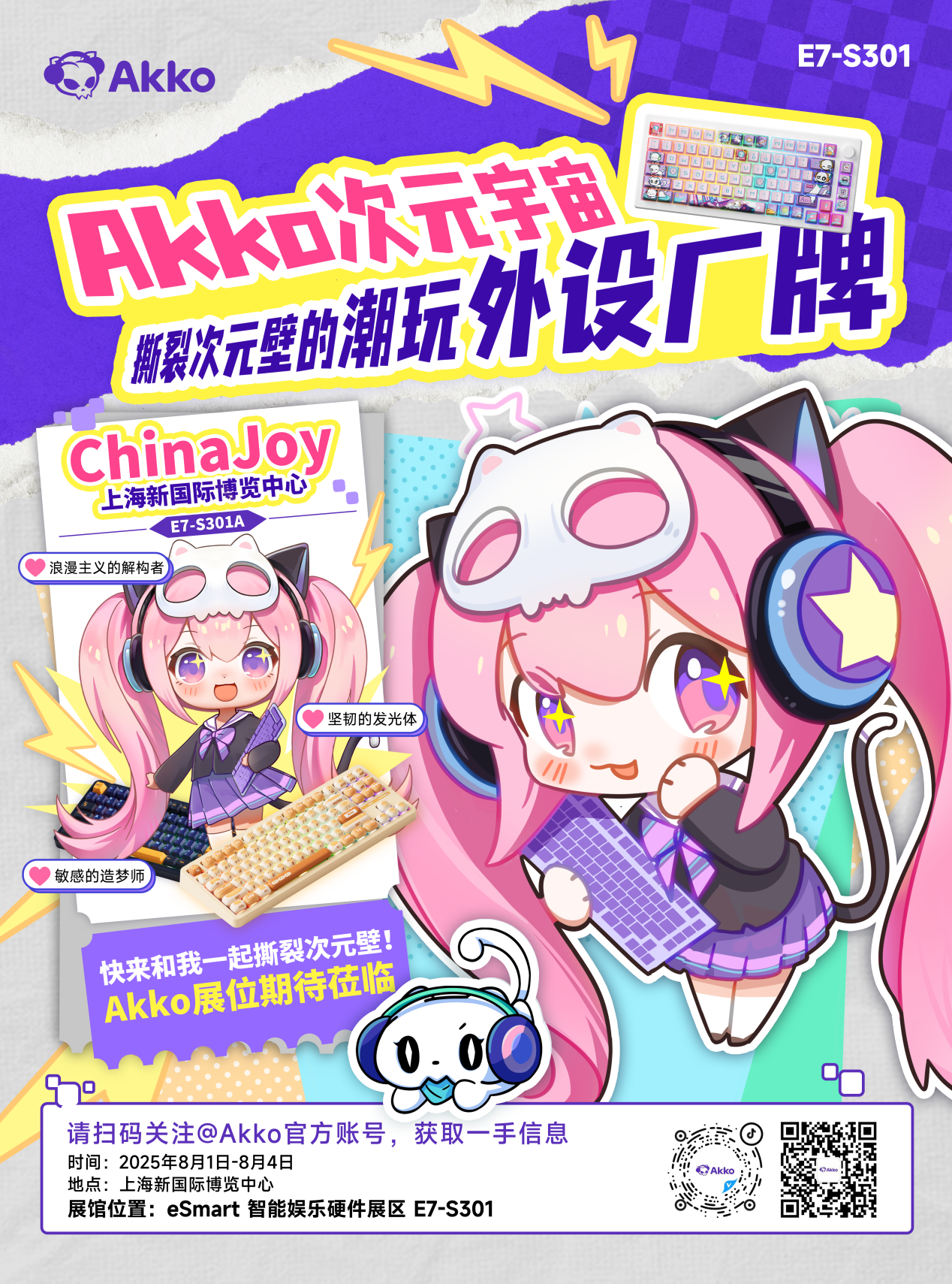年度泛娱乐盛典ChinaJoy 2025即将于 8 月 1 日至 8 月 4 日登陆上海新国际博览中心!潮流外设风向标—— Akko已锁定黄金展位 E7-S301,火力全开,准备掀起一场视觉、触觉与收藏欲的终极狂欢!