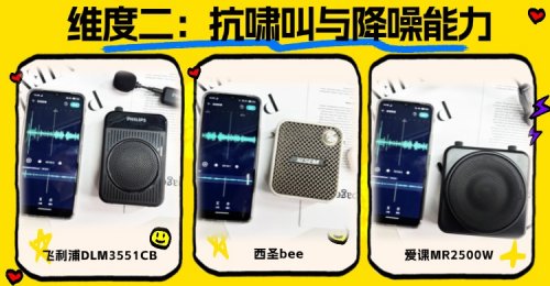 西圣Bee的扩音清晰度表现十分优异,实测中人声还原得清晰、饱满、自然,几乎没有任何失真或刺耳感。这样的表现得益于它搭载的16 芯全频大尺寸声音单元,能够细腻呈现人声细节,让声音通透、有层次;再加上HiTone™人声动态增益调控,可实时优化人声频段,避免出现爆音或发闷的情况。长时间使用后,音质衰减非常小、整体输出依旧稳定,是三款中最接近「原声放大」质感的一款。爱课MR2500W的扩音清晰度表现中规中矩,人声基本清晰,能满足日常基础扩音需求。其高灵敏海绵降噪咪芯能减少部分环境杂音,但声音细节和层次感一般,整体听感偏平淡。飞利浦DLM3551CB的扩音清晰度表现稳定,大功率内磁喇叭让声音更厚实、音量更充足,听感清晰自然。不过在细节还原和层次感上不如西圣Bee,整体音质饱满度稍逊。维度二:抗啸叫与降噪能力抗啸叫与降噪能力是衡量小蜜蜂扩音器专业程度的重要指标。为了避免次等小蜜蜂,于是对比测试了三款小蜜蜂扩音器的防啸叫,降噪功能看看哪款小蜜蜂扩音器的表现最出色。