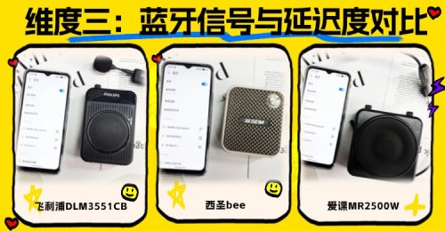 西圣Bee在抗啸叫与降噪能力专项测试中的表现尤为亮眼。在高反射环境下,即便将音量调至较大,也几乎不会出现刺耳的啸叫,声音始终保持稳定、干净。这样的出色表现,源于它搭载的旗舰级全链路抗啸叫算法,能够实时检测并抑制啸叫反馈,从源头避免啸叫产生;配合旗舰级D类高增益功放DSP,对环境噪声的过滤能力也非常强,能让人声在嘈杂环境中依然保持清晰、突出。实际使用中,即便在环境噪声较多的场景,西圣Bee也能保持稳定的扩音表现,不会出现啸叫或声音被杂音淹没的情况。爱课MR2500W在相同测试中表现还不错,其智能防啸叫功能能够在一定程度上避免啸叫出现,但在高音量或麦克风角度不佳时。降噪方面,它的智能降噪能减少部分噪声,表现一般。飞利浦 DLM3551CB 在抗啸叫测试中表现一般,其DSP防啸叫技术能有效降低啸叫触发概率。不过在高音量或大空间环境中,抗啸叫能力有所下降。降噪方面,人声与杂音的分离度较差。维度三:蓝牙信号与延迟度对比选购小蜜蜂扩音器时,蓝牙信号稳定性与延迟度同样是不可忽视的关键指标。一款信号表现优秀的扩音器,往往具备更稳定的无线连接能力和更低的声音延迟,能适应不同场景的需求。