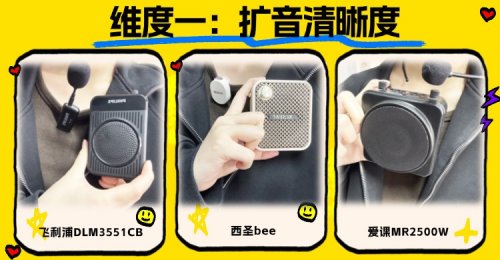 √品牌背景:飞利浦是全球知名消费电子品牌,在音频领域有一定市场积淀,扩音器产品主打品质稳定,面向教学、演讲等用户,定位中高端实用型。√佩戴体验:机身重183g,偏重,长时间佩戴易不适;活动时设备易晃动,可能影响拾音稳定。√核心性能:搭载360°全指向麦克风+DSP防啸叫技术,减少背景噪声,拾音纯净;大功率内磁喇叭,音量充足清晰。支持蓝牙5.0+2.4G无线双模式,20米稳定连接,适配灵活走动场景;也支持3.5mm TRS有线连接,功能多样。麦克风与扩音器续航均8小时,满足短时间使用。√不足与适用:无录音功能,限制应用范围。适合中小型室内扩音,适合对录音无需求的教师、小型会议主讲人等。三、小蜜蜂扩音器实测结果接下来,我将基于真实的实测数据,对三款小蜜蜂扩音器的核心性能差异展开深度解析,重点对比扩音清晰度、抗啸叫、降噪、蓝牙信号稳定性等关键维度,帮大家精准锁定综合表现更出色、且更适配自身使用场景的那一款。维度一:扩音清晰度扩音清晰度是评判小蜜蜂扩音器专业性的核心指标,其表现并非单靠功率参数就能决定,接下来用三款扩音器说话相同的内容,用人声还原度作为扩音清晰度高低的核心评判依据。