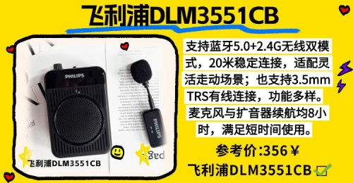 √品牌背景:爱课是主打基础扩音需求的大众品牌,产品定位入门级,面向普通消费者,核心适配日常简单扩音场景,整体走实用亲民路线。√佩戴体验:采用头戴式设计搭配30g轻量化麦克风,佩戴时贴合头部,质地轻盈,长时间使用不易产生压迫感;不过扩音器主机重量450g,相对偏重,日常携带会有一定负担。√基础性能:配备高灵敏海绵降噪咪芯,能减少环境杂音干扰,单指向麦克风拾音精准,配合智能防啸叫功能,扩音效果清晰。支持2.4G无线传输(15米内稳定)和蓝牙5.0连接,传输流畅;麦克风续航4小时、扩音器续航8小时,可满足短时间使用需求,Type-C充电接口便捷,同时支持3.5mmTRS接口、U盘/TF卡、AUX等多种功能,功能覆盖全面。√适用场景:基础性能达标,便携性一般,更适合短距离使用场景。3、飞利浦DLM3551CB无线领夹扩音器