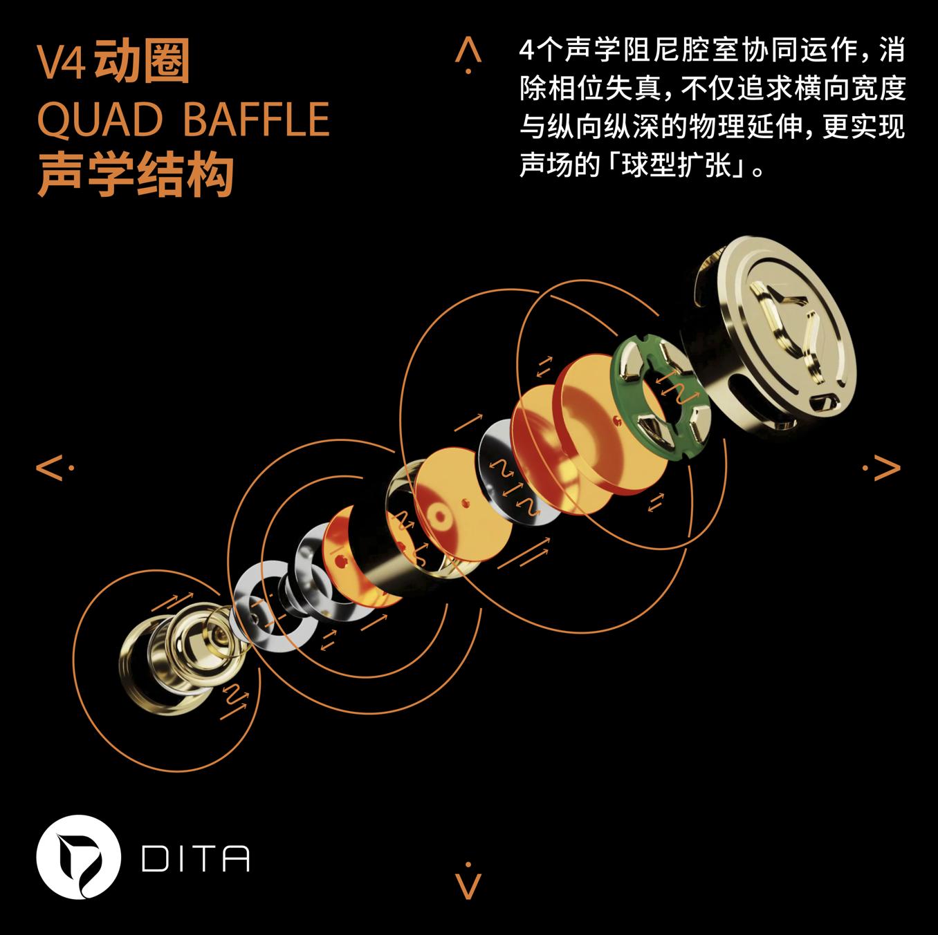 Dita喜欢鼓捣各种振膜,V4QB单元的新振膜,是我没见过的,钛+陶瓷复合材质,表面有薄薄的PVD镀金层(振膜覆纯金镀层,一般会为音质带来些许黄金材料独有的,更具华美润色度的“音色美感”)。