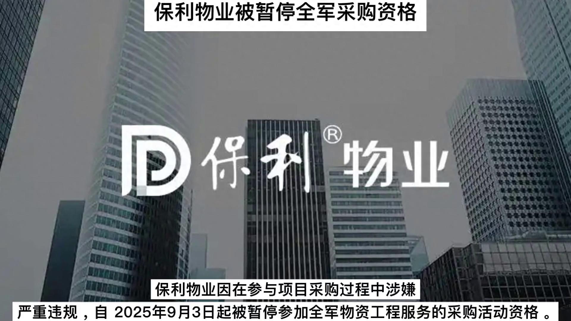 保利物业被暂停全军采购资格。保利物业因在参与项目采购过程中涉嫌严重违规,自2025年9月3日起被暂停参加全军物资工程服务