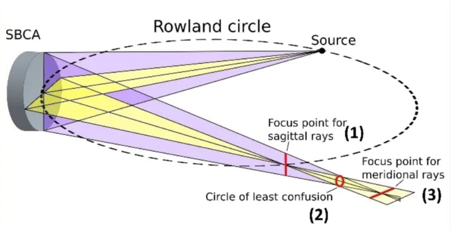 可通过狭缝调整光束尺寸;圆几何结合点 X 射线源与布拉格角≠90° 的 SBCA 时,SBCA 会产生像散误差(类似光学透镜,形成两个垂直分离线像),进而出现三种光束几何形状(两个分别垂直 / 平行于 Rowland 圆的线焦点,及中间的圆形模糊斑,见图 11),需结合样品与探测器的尺寸形状,优化利用焦点以提升操作态实验效率。