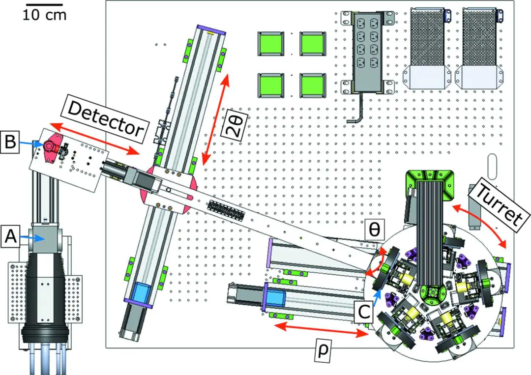 SBCA图9:用于在不同吸收边进行操作态实验室实验的球面弯曲晶体分析器,放置在自行设计的晶体交换器中的照片(d)。