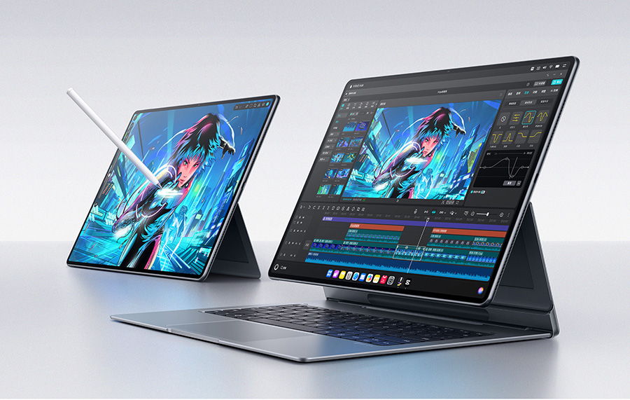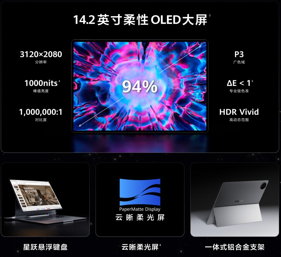 MatePad Edge配备了一块顶级的14.2英寸柔性OLED云晰柔光屏,无刘海设计搭配94%的超高屏占比、3.1K的高分辨率、120Hz高刷新率以及1000nit的最高亮度,为用户带来了高清护眼、沉浸宽阔、明亮细腻的视觉体验。同时,该设备采用多驱动阵列式六扬声器设计,支持移动全景声技术,与HUAWEI FreeClip 2开放式耳机联合发声,组成独立的四声道系统,实现360°影院级声场体验,打造个人专属移动影院。