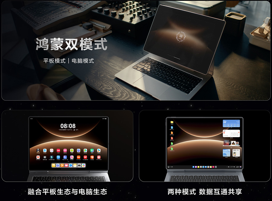 MatePad Edge通过华为首发的鸿蒙双模式,支持平板与电脑两种系统模式自由切换。用户只需四指横划屏幕,即可在“平板模式”与“电脑模式”之间快速转换。平板模式下,用户可以享受丝滑的触控、手写体验和沉浸式大屏休闲娱乐;电脑模式下,则还原了熟悉的键鼠操作、窗口多开等功能,支持WPS、剪映、中望CAD等大量鸿蒙电脑应用,满足PC级的专业办公需求。两种模式下的数据文件、账号等也能同步,实现了从“形式融合”到“体验融合”的跃迁。