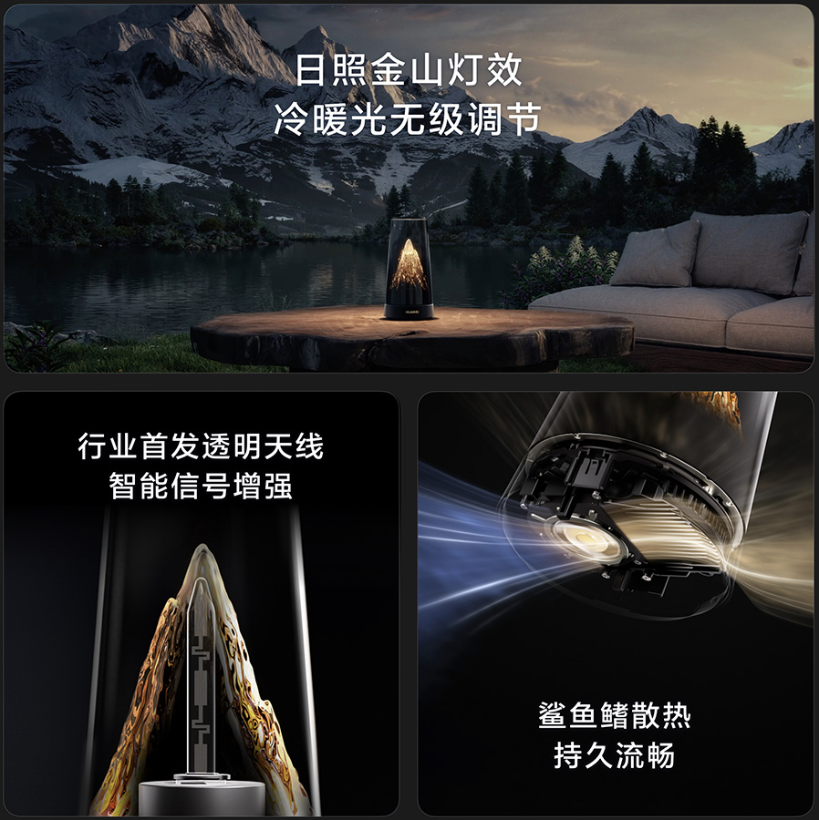 华为路由X3 Pro日照金山版以自然奇观“日照金山”为设计灵感,将雪山顶峰在晨光中呈现的暖金色渐变效果精准复刻于通透机身之内。该产品采用圆柱形机身设计,上半部分透明外壳内嵌入微缩雪山造型,可随日出日落及天气情况自动切换光影模式,还原“日照金山”的自然意境。同时,华为在天线技术上实现了行业创新性突破,推出业界首款透明天线,采用微米级工艺蚀刻精细电路,使天线在保持信号强劲的同时实现视觉隐身,真正做到美如所见,强于无形。