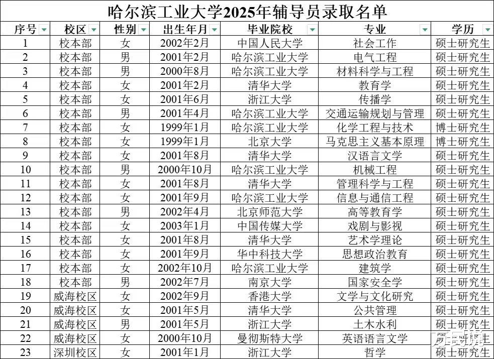 一份来自哈尔滨工业大学:新录用的32名辅导员中,清华北大的毕业生占了整整12个,清一色的硕士博士。