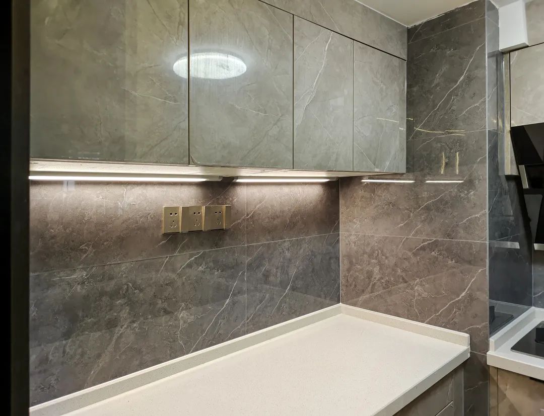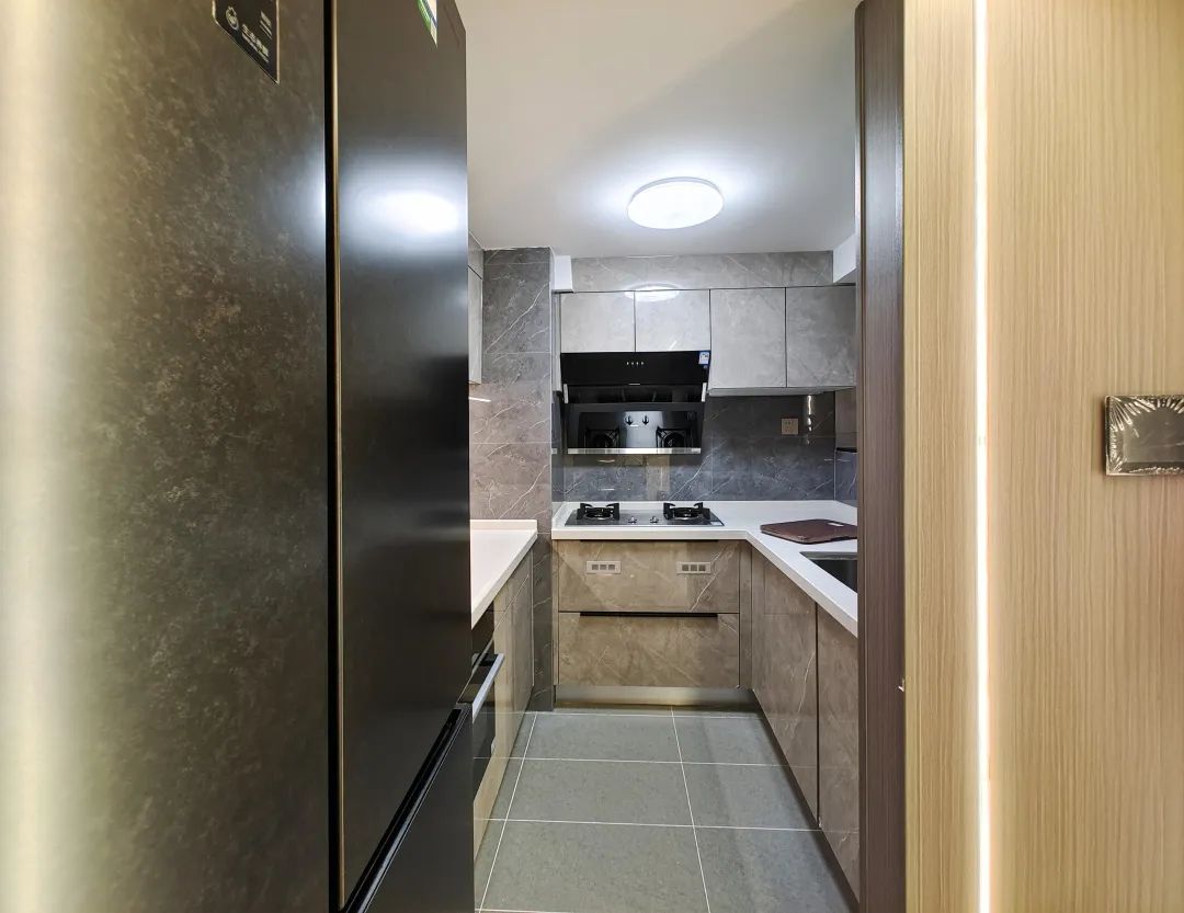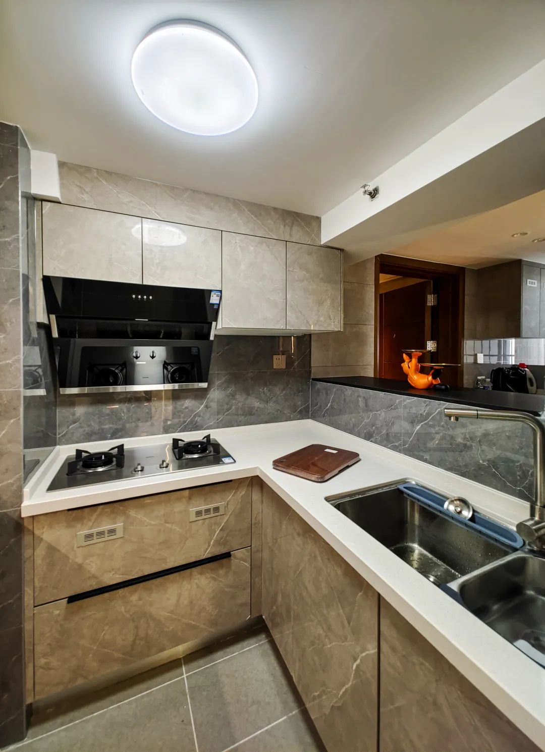 厨房改造成开放式,与入户家政间、客餐厅空间视觉互通,整体通透敞亮,延伸了整体空间感。