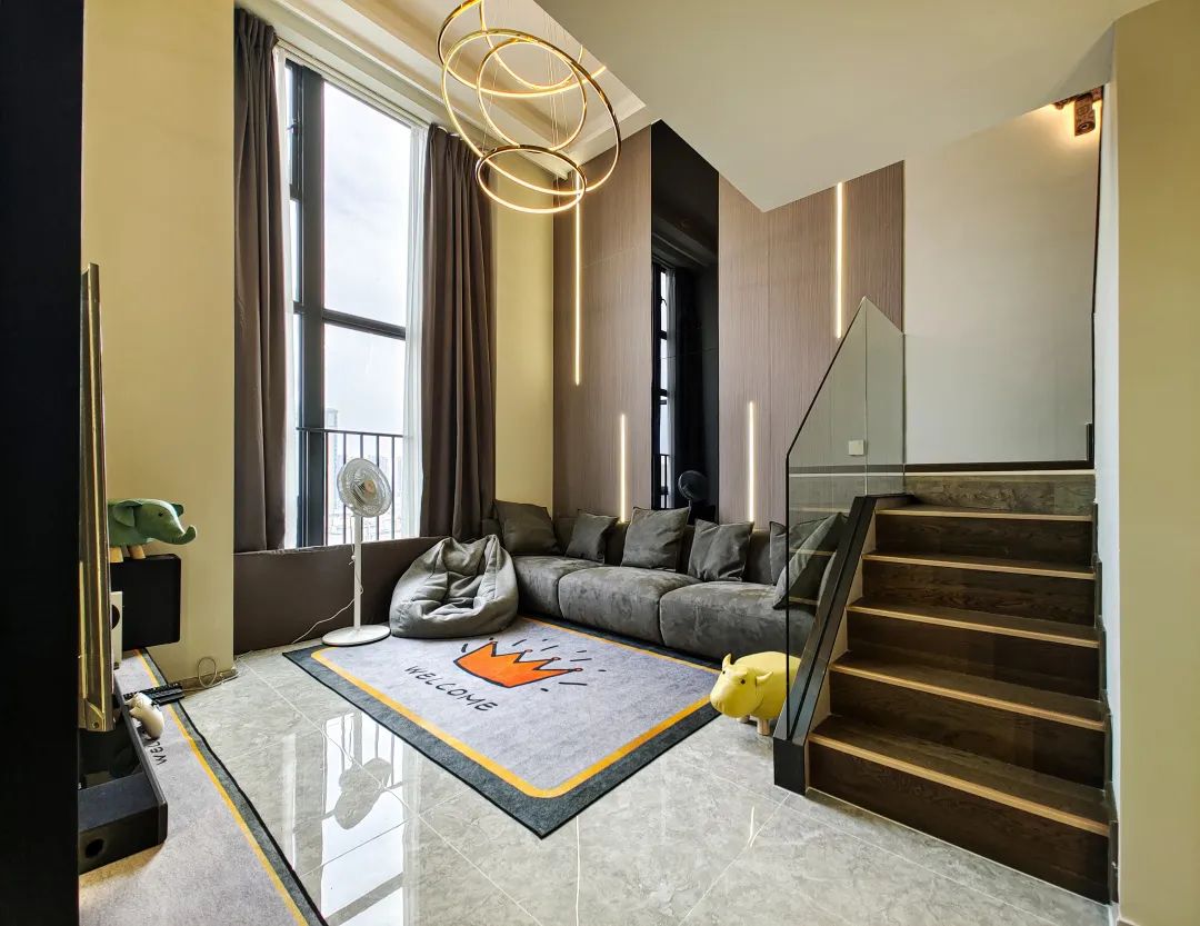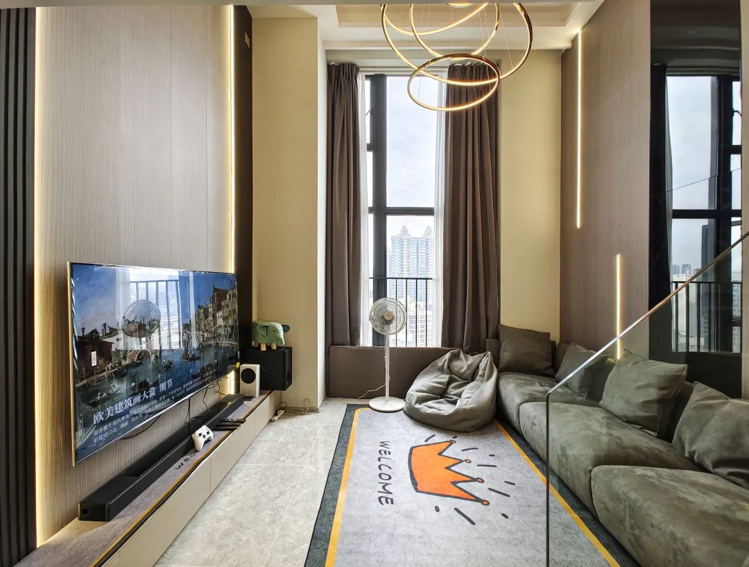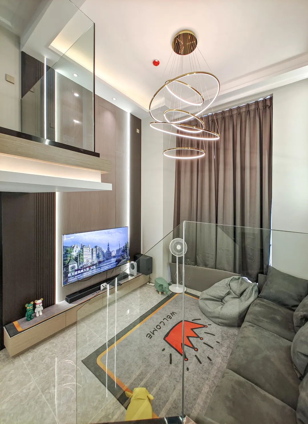 挑高客厅结合整面落地窗显得明亮大气,配上轻奢环形吊灯与干净利落的弱光源线条,整体造型别致,格调满满。