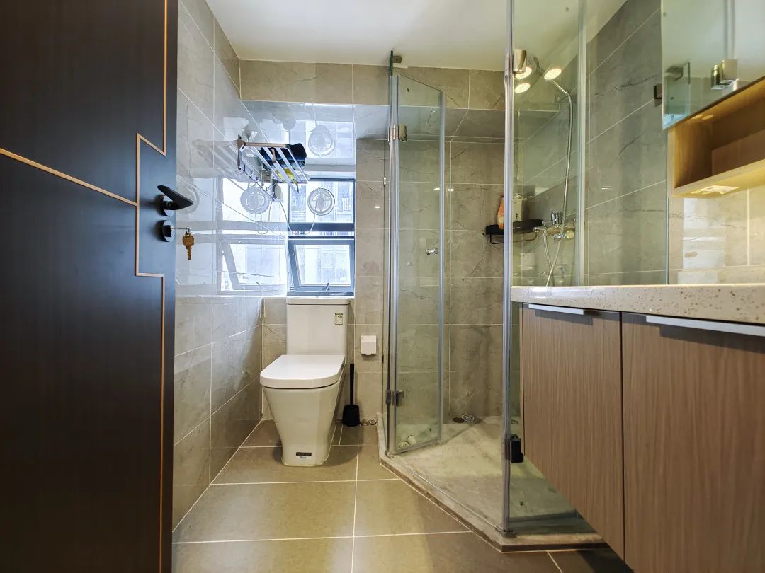 卫生间保持一致,不同深度的灰色墙地砖搭配原木色浴室柜,简洁大气。