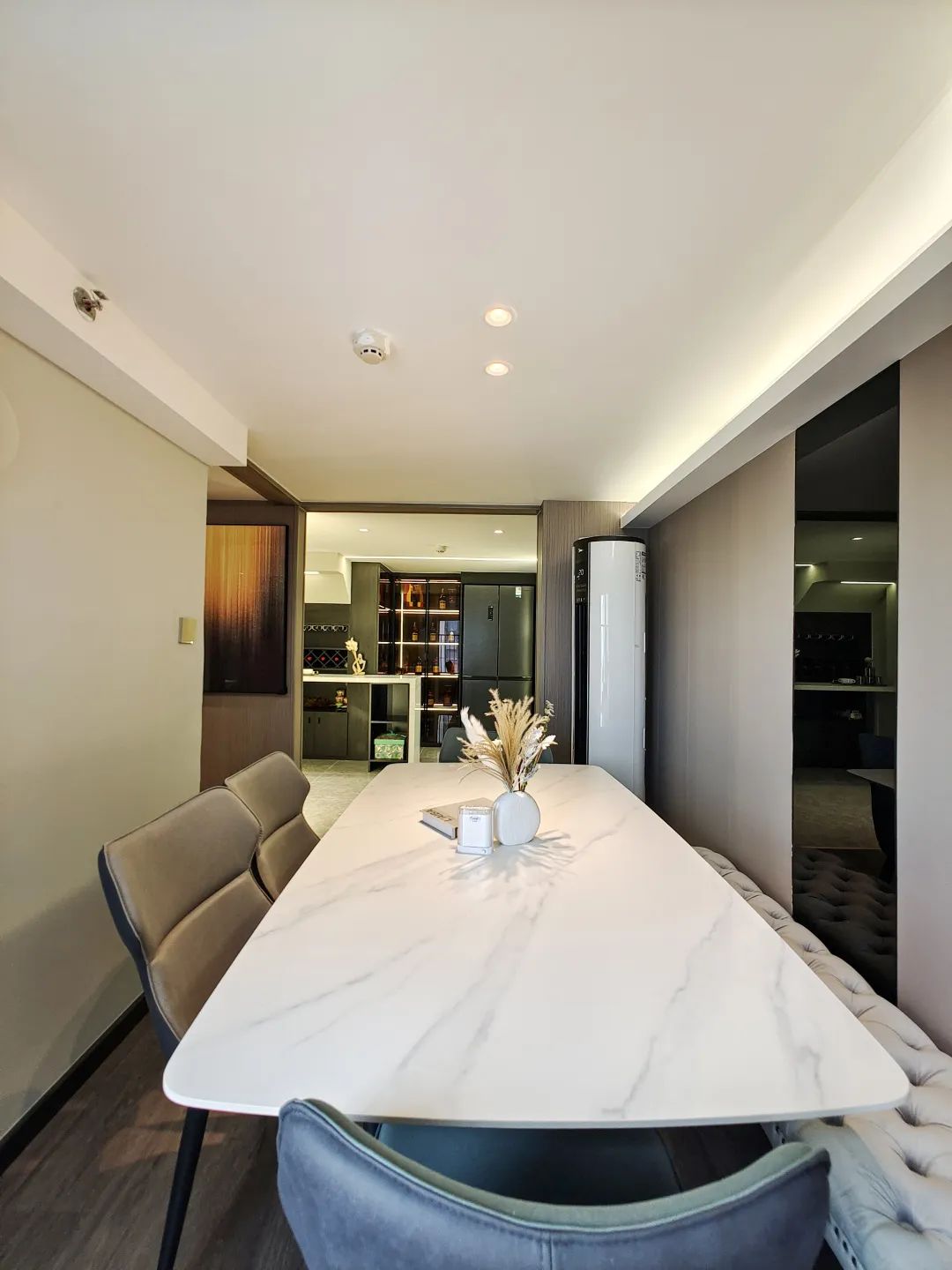 贯彻无主灯设计,一侧定制嵌入式餐边柜,完善收纳美学;另一侧墙面留白搭配精致时钟,在简约的氛围中增添一丝精致优雅。