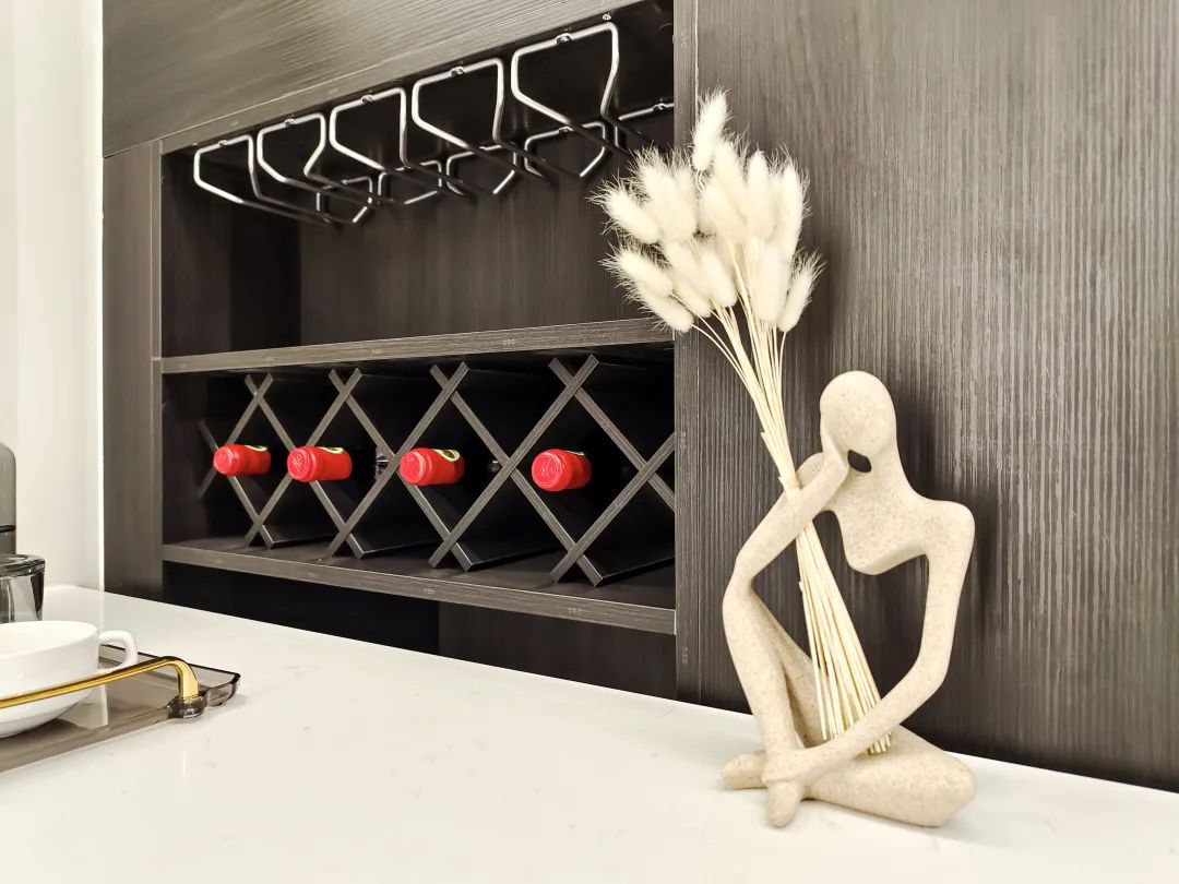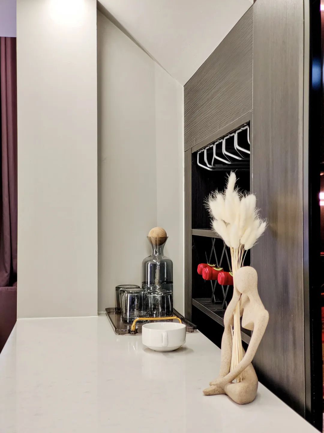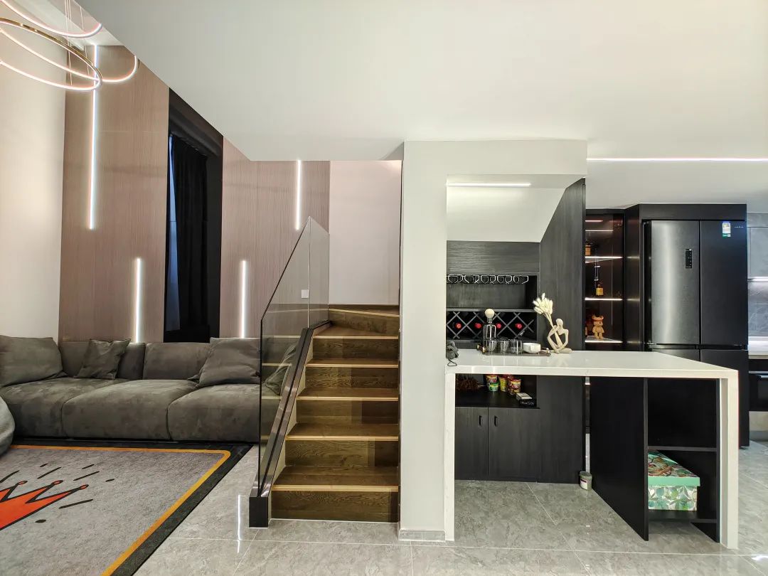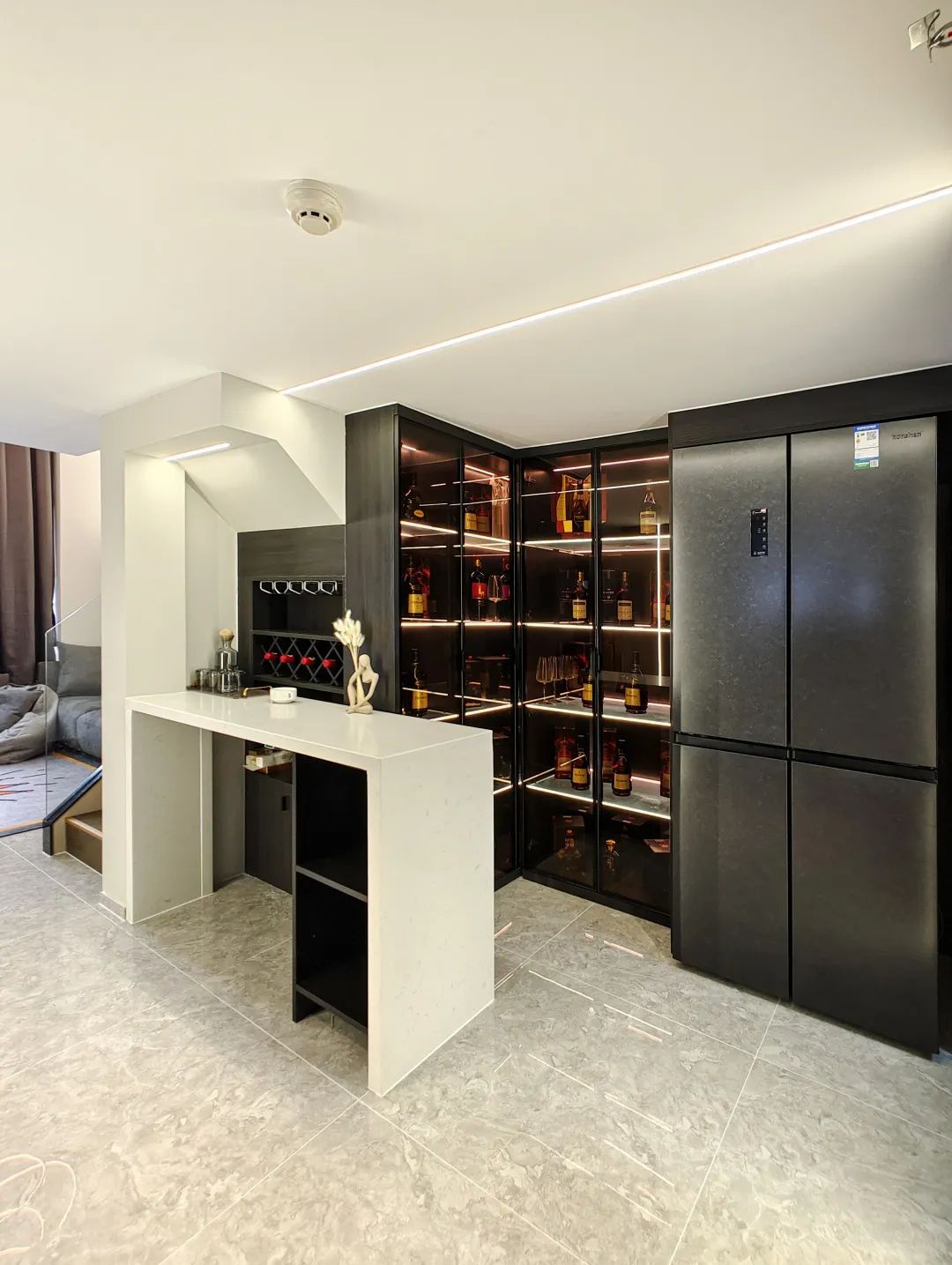 业主有很多藏酒,设计师靠墙定制了酒柜,玻璃柜门搭配内嵌灯带,氛围感MAX。嵌入冰箱与酒柜融为一体,动线流畅。