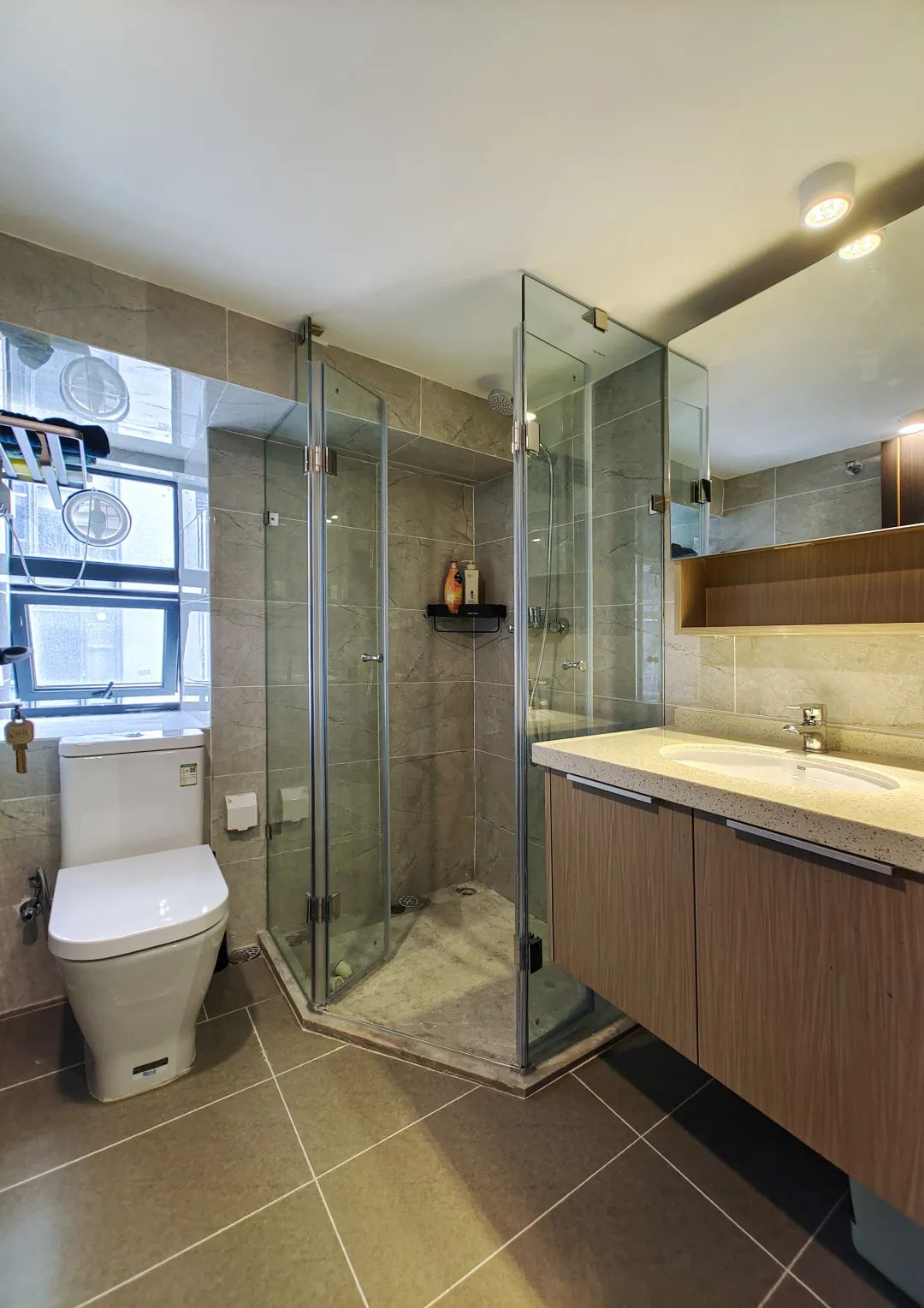 设计单独淋浴房,实现干湿分离。马桶后方借助窗台收纳一些小物件。原木色浴室柜,水磨石洗漱台,温馨而自然。