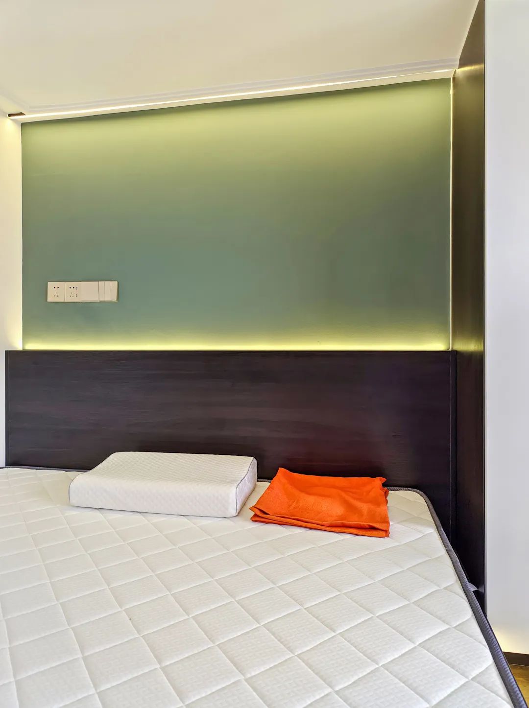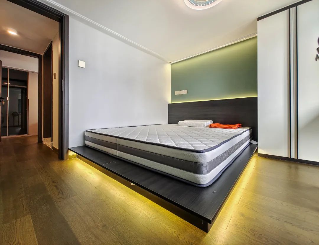 除了顶部的吸顶灯提供基础照明外,我们还在床头上方补充灯线照明,方便阅读。榻榻米地台床周围也嵌入了感应灯带,方便起夜。