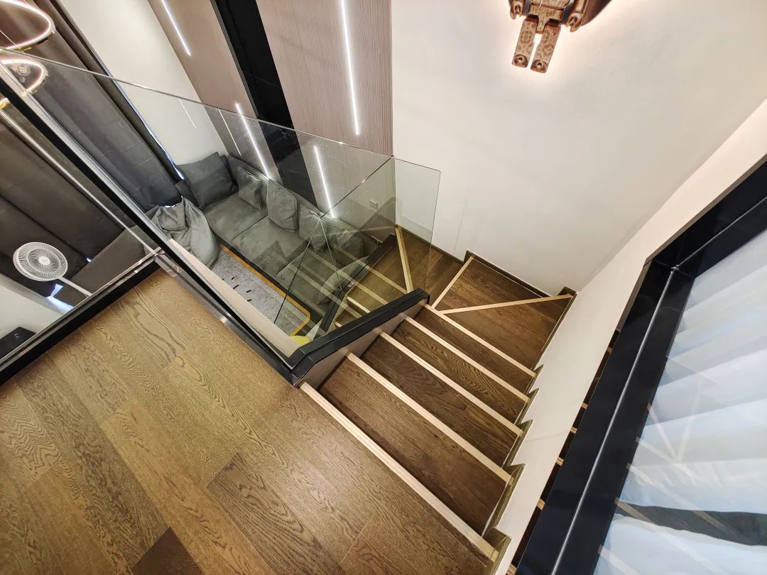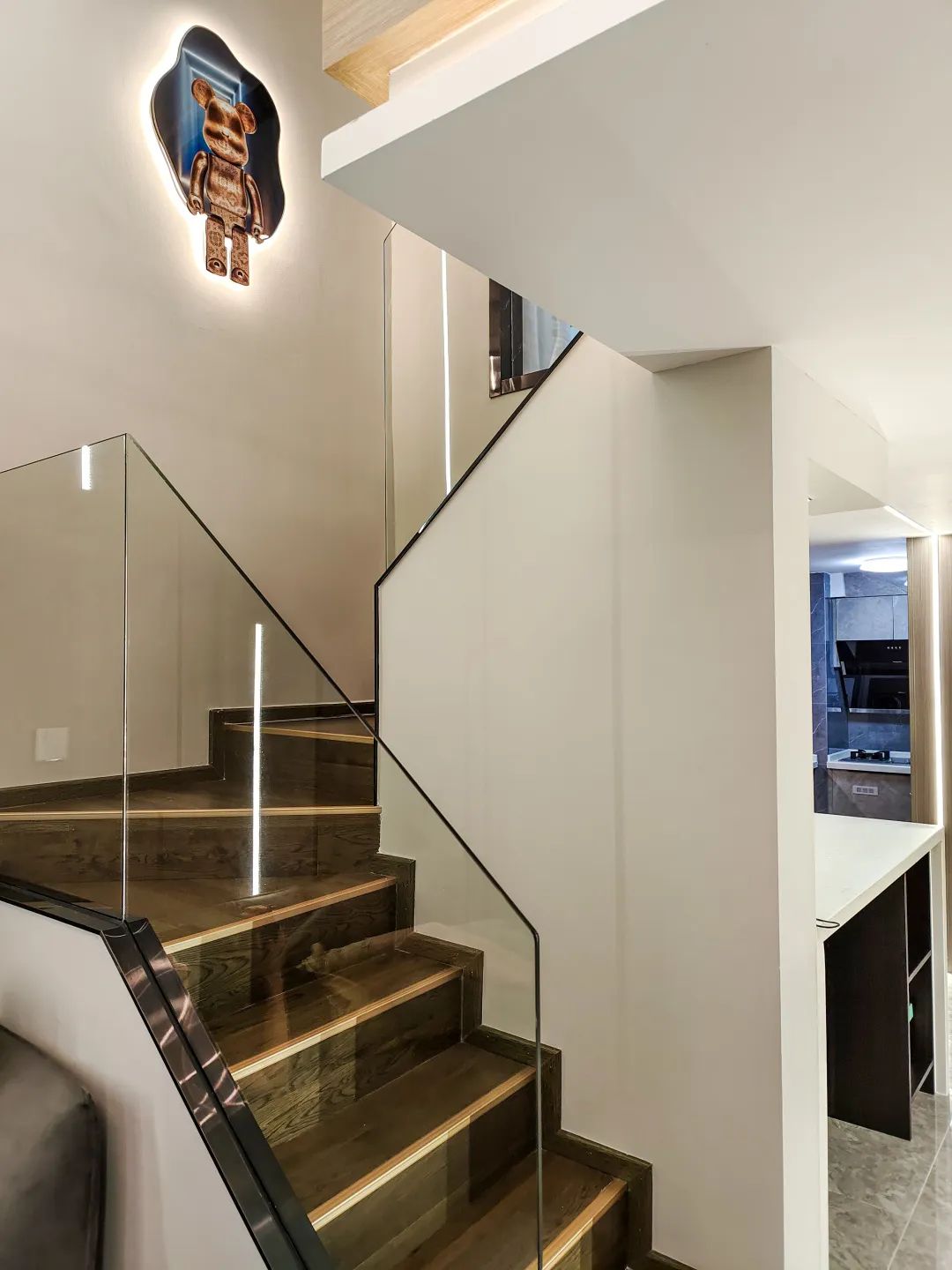 转角楼梯,把简约贯彻到底。木质踏板配上金属收边条,营造闲适轻松的居住氛围,也升华空间格调。