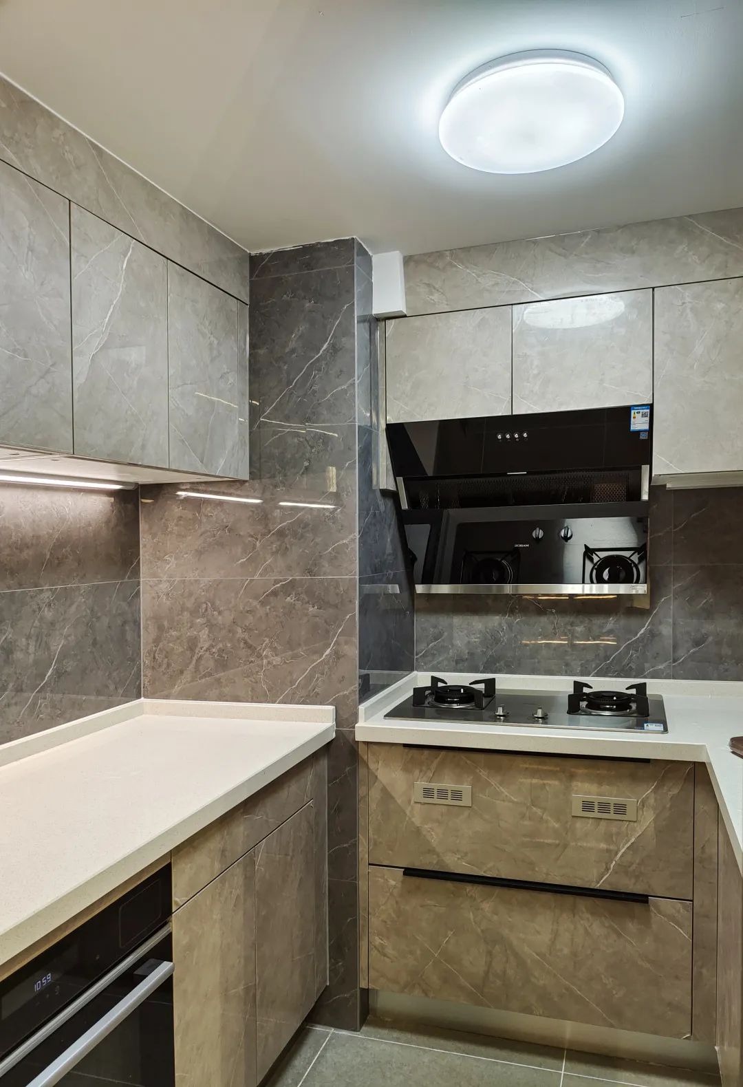 U型布局,橱柜门隐藏把手,使空间看起来更整洁干净,而且收纳能力也不赖。橱柜内也嵌入了大厨电,将厨房空间最大化利用,也增加了生活乐趣。