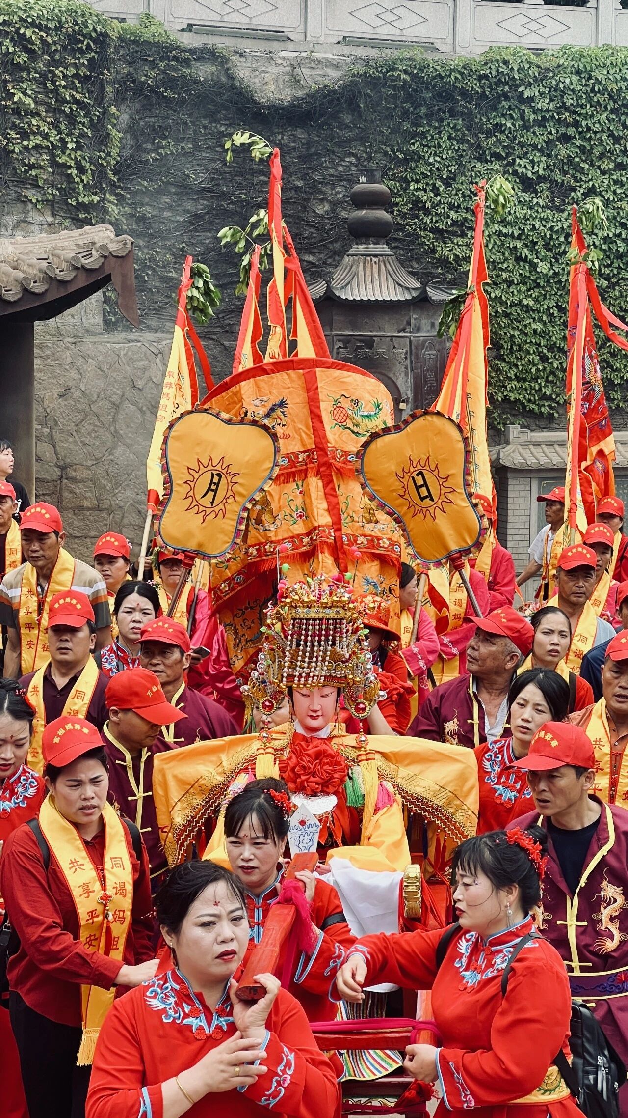 不久后,巡游队伍也浩浩荡荡出发了。 仪仗队开路,车鼓队紧随其后,踩高跷与其他民俗表演者穿梭其中,信女们手持香火虔诚随行。 红绸飘扬中,将红桔的吉祥,梅妃的庇佑,送抵每一户人家。