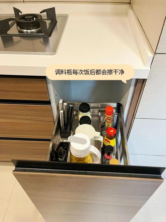 调料用完就及时收进柜子里,保持厨房台面空无一物,自然就可以让整个厨房看起来清爽有序。