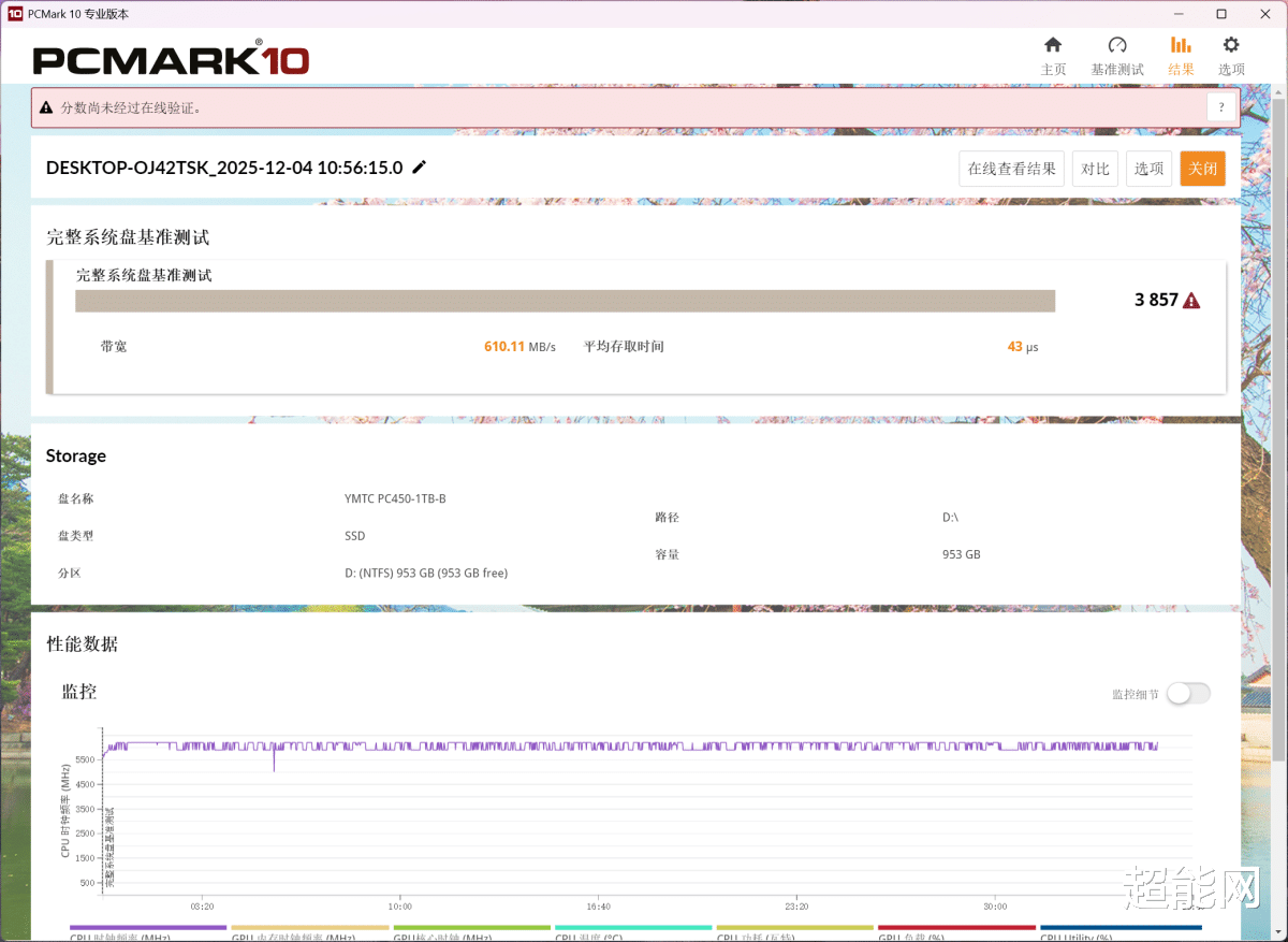 长江存储 PC450 1TB在PCMark 10存储测试中得分可以来到3857分,平均传输速率610 MB/s,延迟43 us,对于无缓存方案的SSD来说已经是一个较为不错的成绩了。