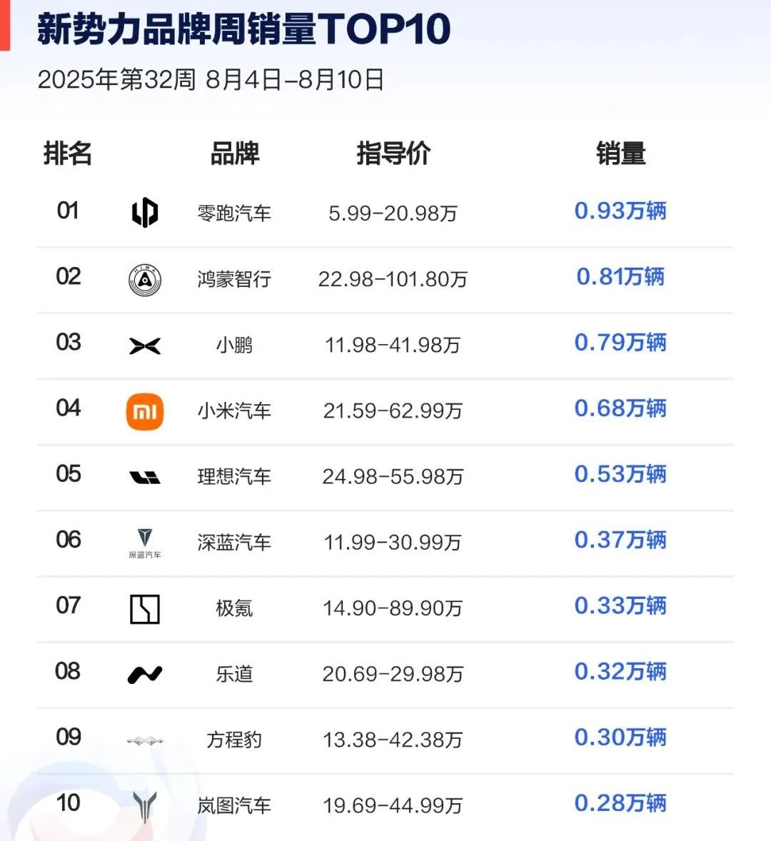 8月12日,公布了2025年第32周(8月4日-8月10日)新势力周销量榜单。零跑汽车以0.93万辆的成绩超越鸿蒙智行和