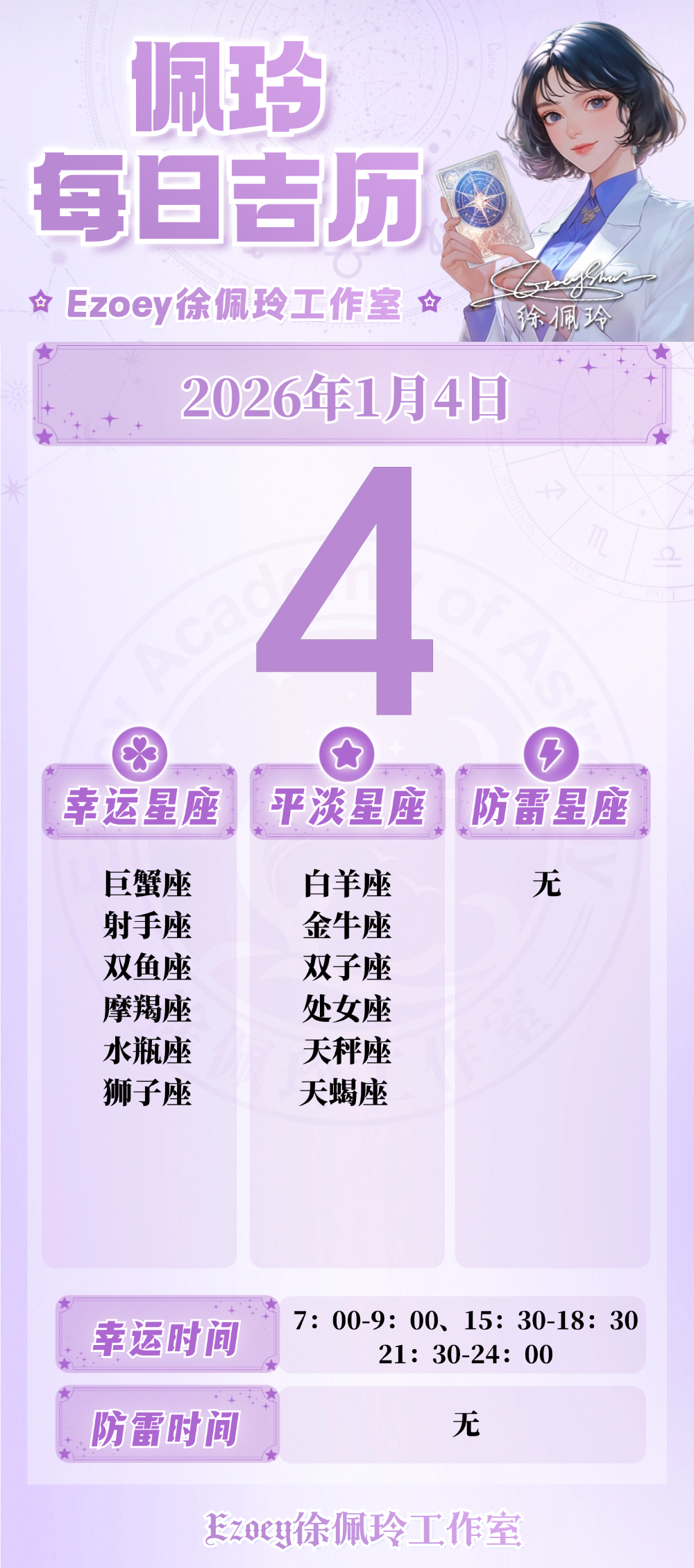 【1.4日播报】闪亮魅力日 幸运星座:巨蟹座、射手座、双鱼座、摩羯座、水瓶座、狮子座——Ezoey徐佩玲26年星座播报