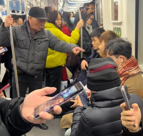 小伙子表示这个标志跟自己的座位没有关系,大爷实在是太生气了,一边上手扒拉小伙子的手机一边说:“跟你有啥关系……你出去,不要拍我!”