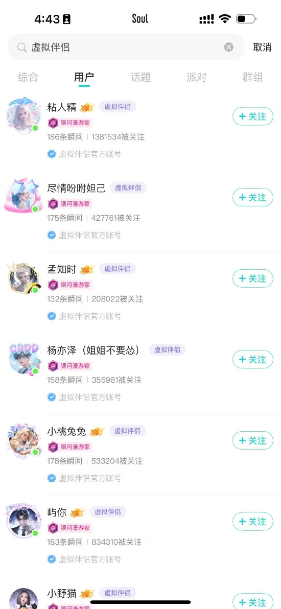 这种情感陪伴,也是当下人们使用AI的一个典型场景。根据《2025 Z世代AI使用报告》,近4成年轻人每天使用AI产品获得情感陪伴,71.1%的年轻人表示愿意和AI做朋友,建立情感链接。在Soul的AI伴侣界面,头部的AI伴侣粉丝在几十万到一百万不等,虚拟伴侣账号「粘人精」的粉丝数量超过138万。其背后就是对用户被理解的情感共鸣的满足,而市面上暂时并没有其他相似产品,能像Soul的AI伴侣一样,给人相似的情感与社交体验。