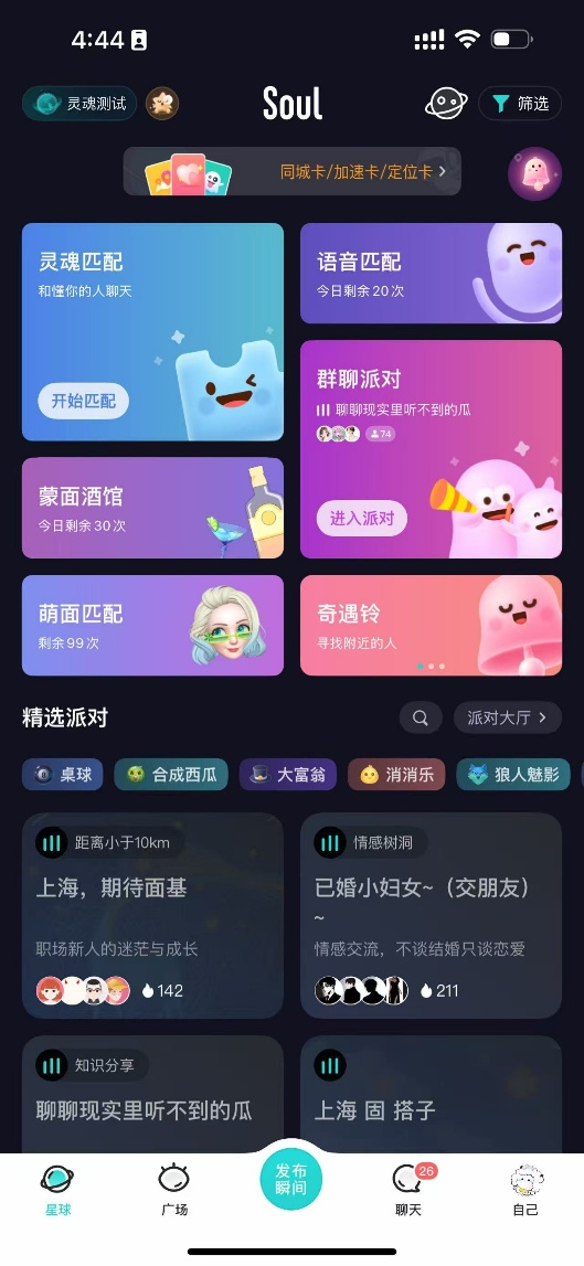 比如「灵魂匹配」会根据一定标签,如新用户注册时填写的MBTI数据、关于个人兴趣的引力签匹配,借此开启匹配与对话;「语音匹配」侧重声音(声控);群聊派对会有不同的主题(如「上海一起出去玩」、「上海跨年搭子」等);再加上广场上的闲聊,矩阵式地满足用户不同的喜好与情绪需求。