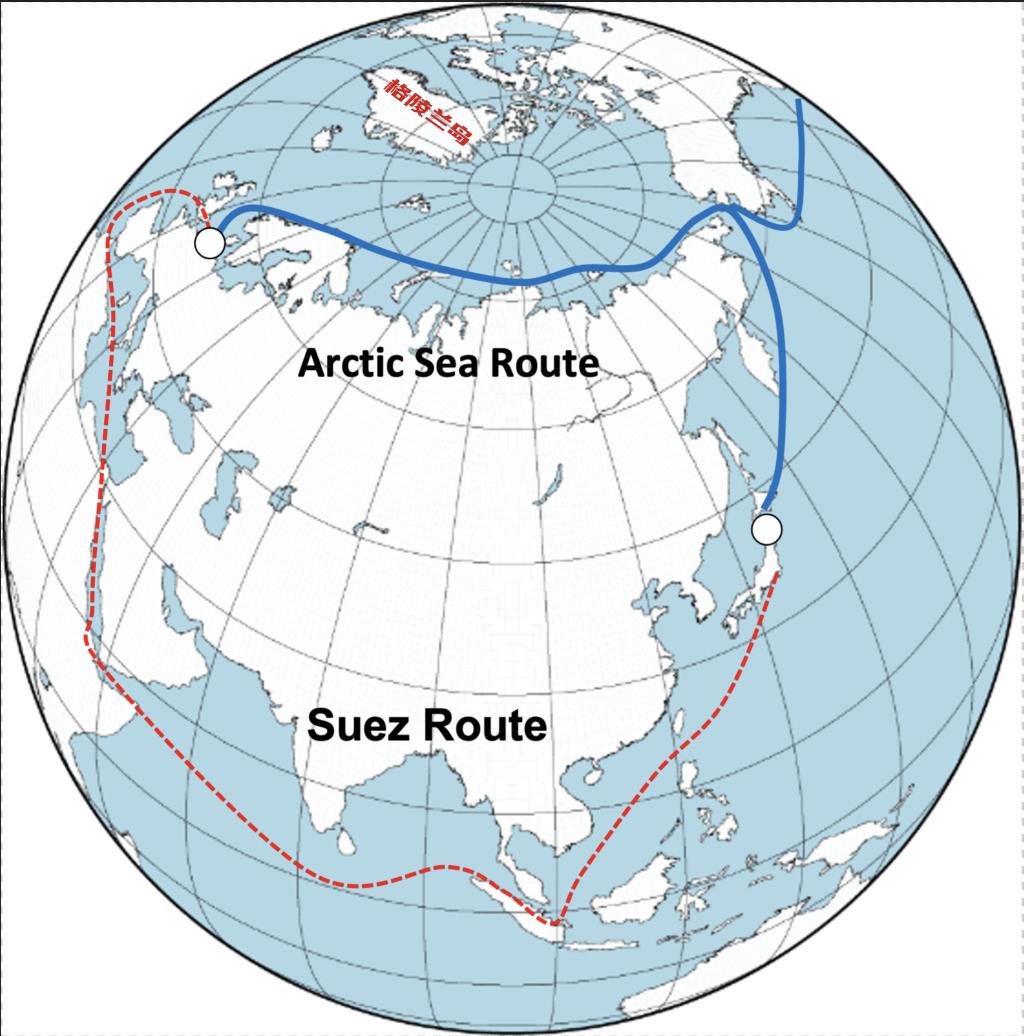 而北极航线,是由于全球气候变暖,厚厚的海上冰层逐渐融化,而新形成的航线,从地球仪的顶端看过去,我们能非常直观地感受到北极航线的便利:它能极大缩短东亚到欧洲的国际航运的距离。