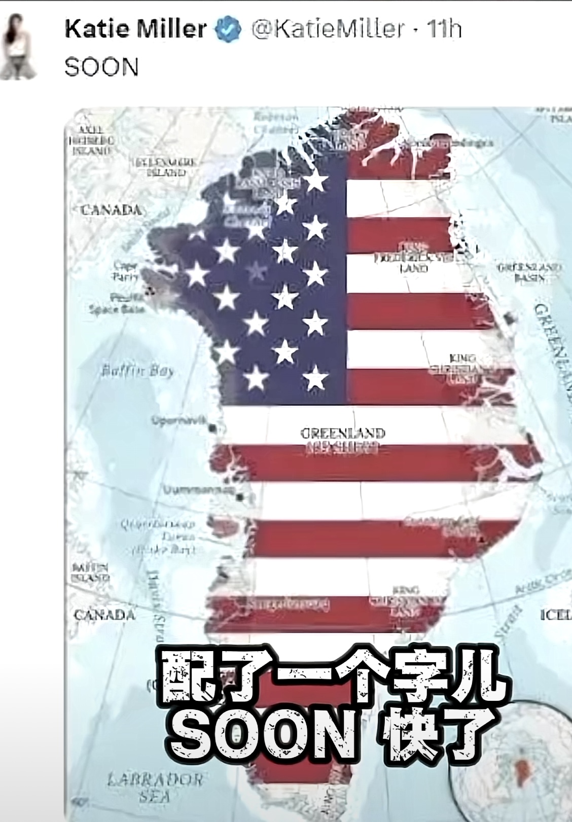 从目前透露的信息来看,美国拿格陵兰岛的愿力是比较强的。前几天,特朗普的副幕僚长泰勒的网红老婆就在X平台发表了一张格陵兰的照片,还配了一个字“SOON”,这就是“快了”的意思。