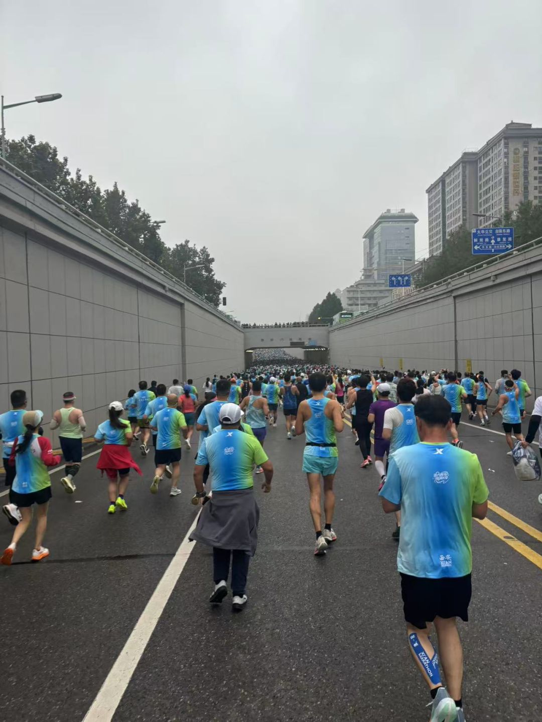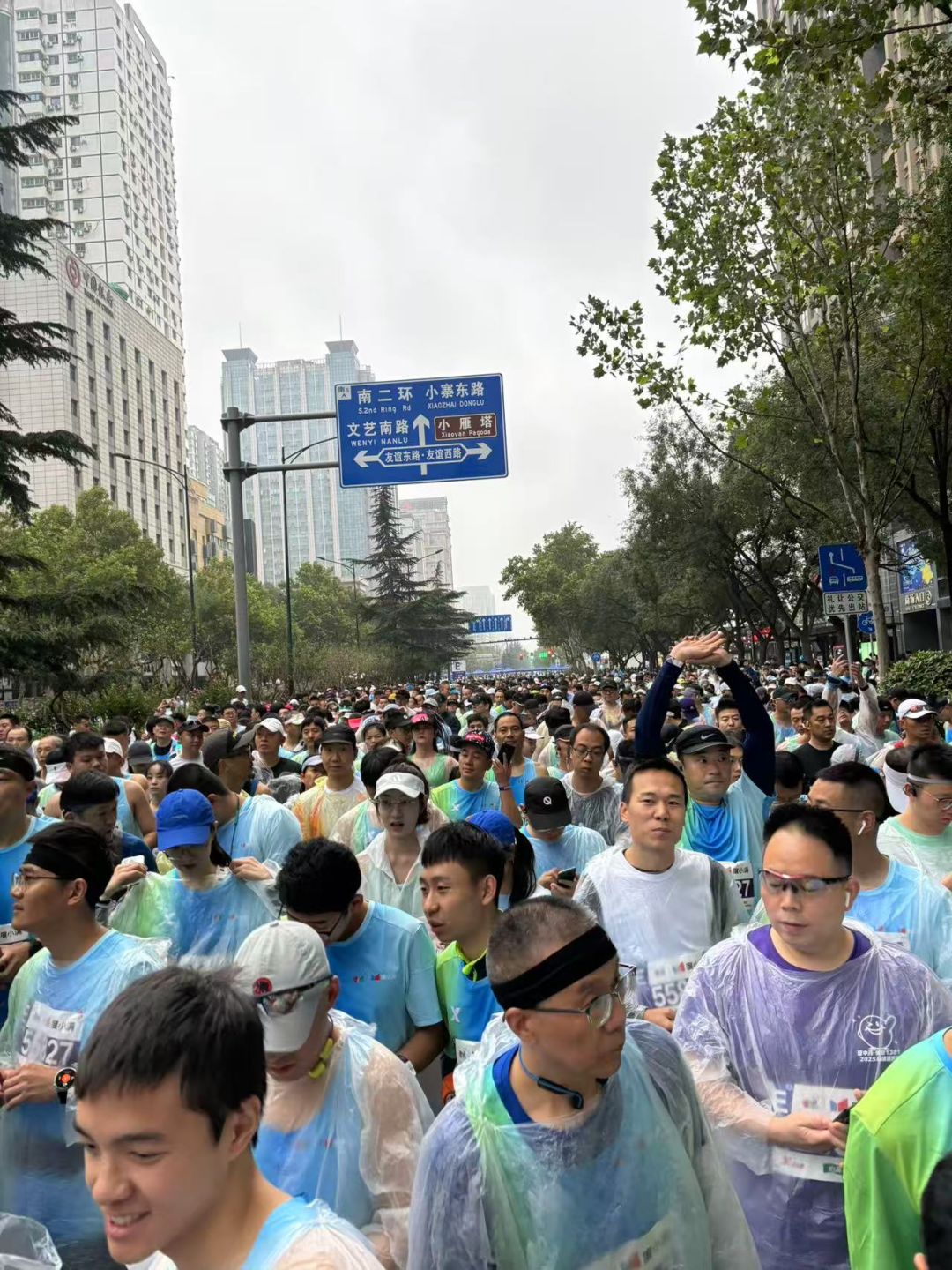 因为没有既往成绩,是从后面的E区出发的,一会走一会跑,跑都跑不了一百米又得停下来,等到了南门起跑点,发令枪响都过去20多分钟了,中间一会关表一会开表,调表都调了好几次。更重要的是,整个节奏都乱了,刚开跑七分多的配速,心率都飙到了150多。