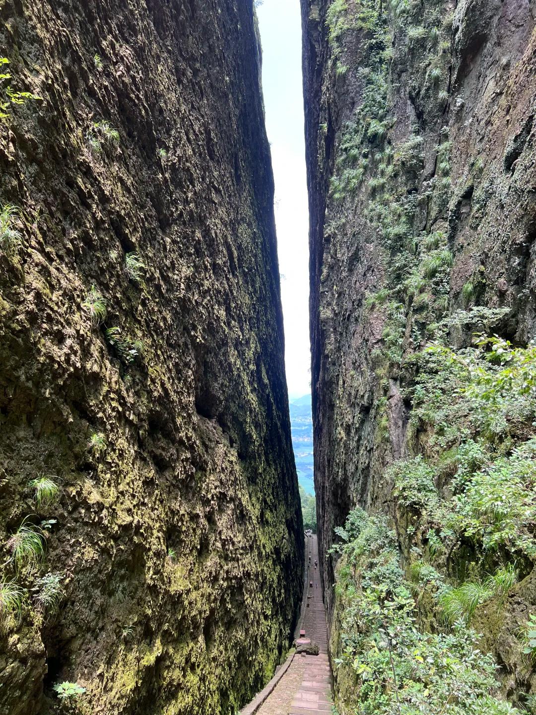 江山,名字大气。山也确实奇。江郎山有三块万仞巨石,直插云天,像三位顶天立地的巨人,披着霞光在云端低语。这三巨石名为“郎峰”、“亚峰”、“灵峰”,传说为江氏三兄弟化身,守护着这片土地。最妙的是“一线天”。两座山峰挨得极近,中间只留一条窄窄的缝隙。走在里面,抬头仰望,天就是一条细长的蓝线。岩壁陡峭如削,苔藓斑驳,石缝间偶尔渗出水珠,清凉沁人。这时候,人会觉得自己很渺小,烦恼也变得微不足道,仿佛天地间只剩自己与这奇崛的山石,心灵得以涤荡。