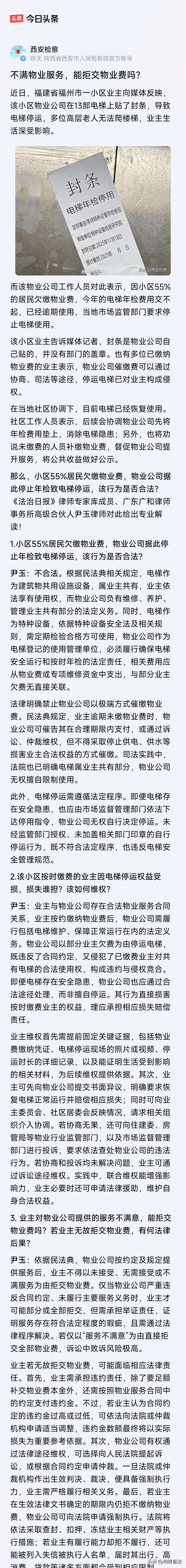 福建福州,一男子在社交媒体上爆料,该小区物业公司在13部电梯上贴了封条,导致电梯停运,多位高层老人无法爬楼梯,业主生活深受影响。小区的物业则表示,主要是因为业主没有缴费,所以会停运。不少网友纷纷提出疑问,不满物业服务,能拒交物业费吗?