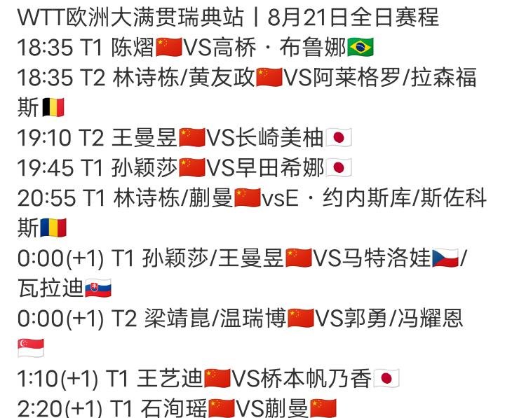 北京时间8月21日,2025WTT欧洲大满贯瑞典站继续进行。