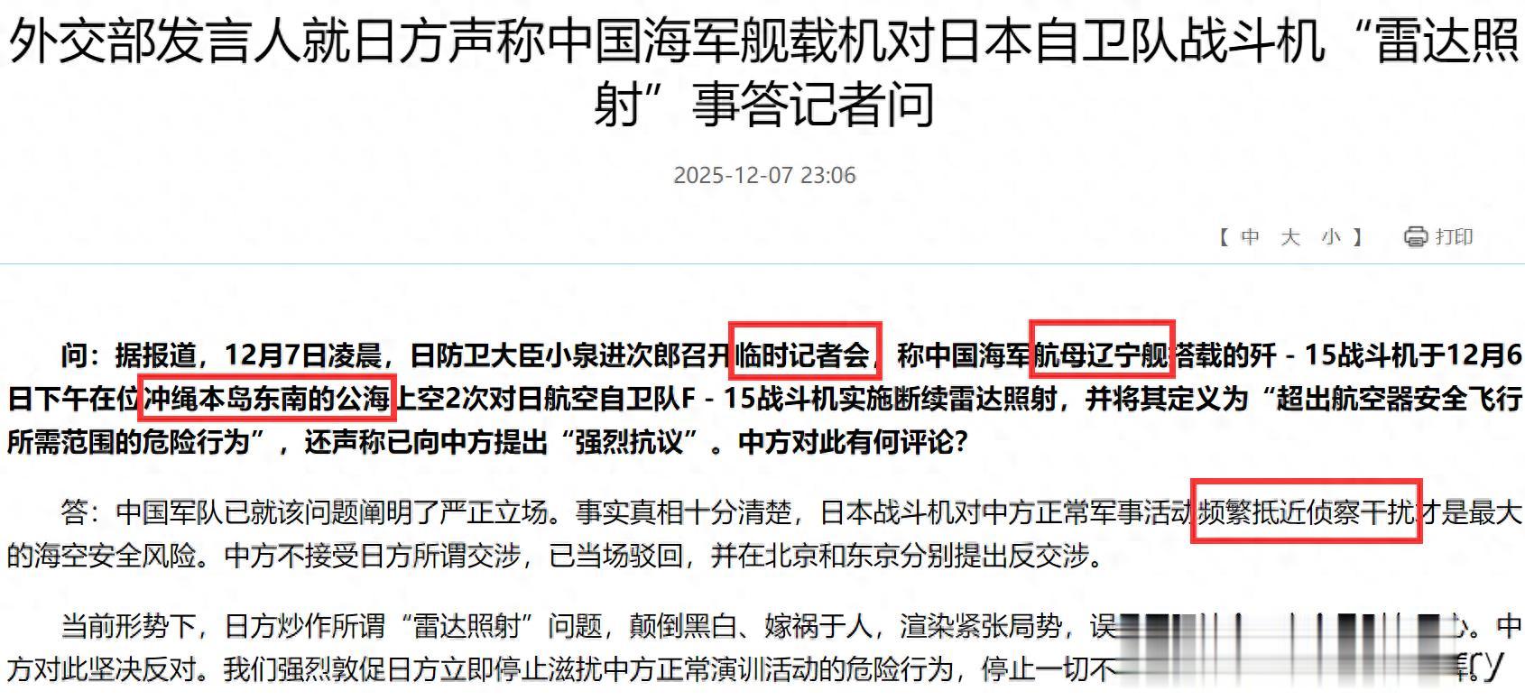 知人知面更知心事后,高市首相对媒体说:“极为遗憾,已向中方提出强烈抗议,严正要求防止再次发生,将冷静而坚决地应对”,在针对中国军方的警戒监视活动上,将做到万无一失。
