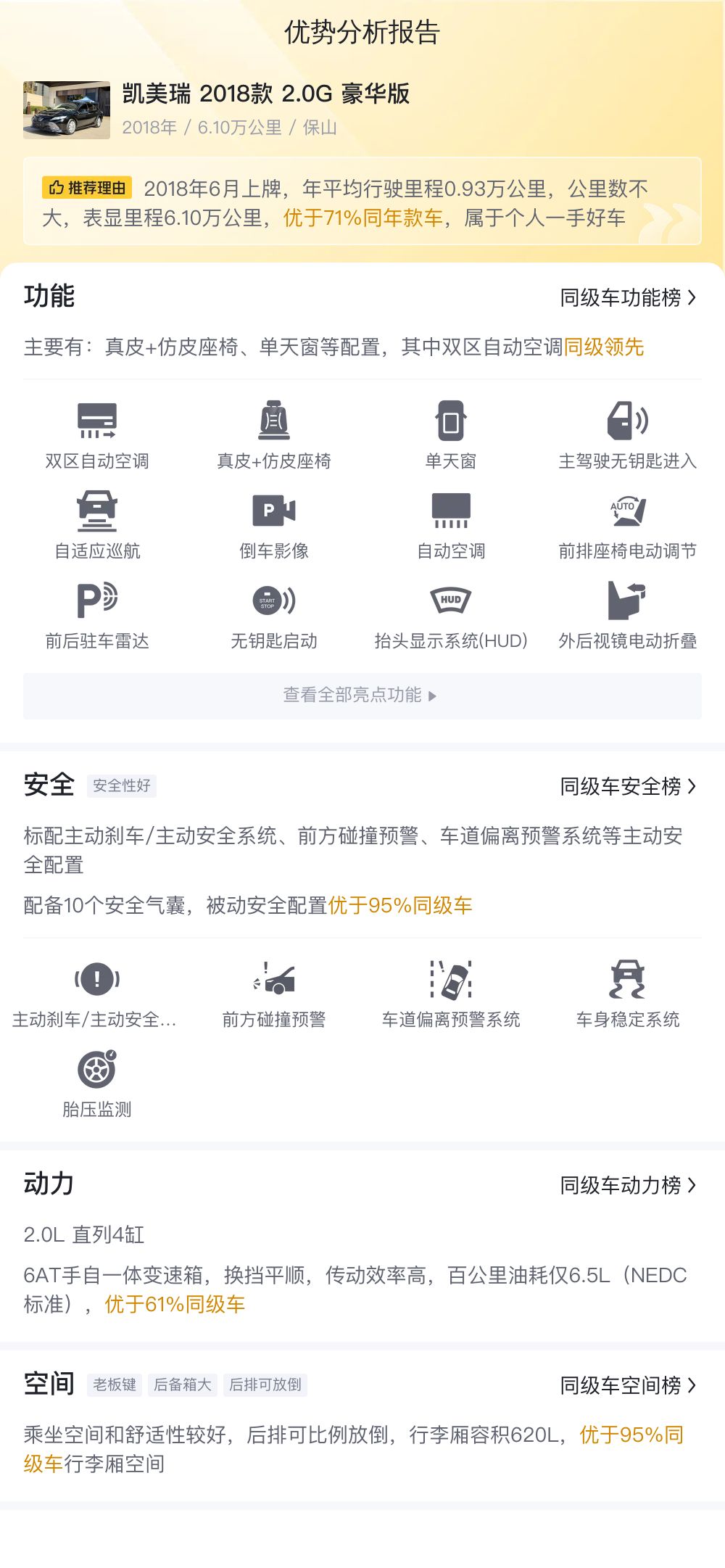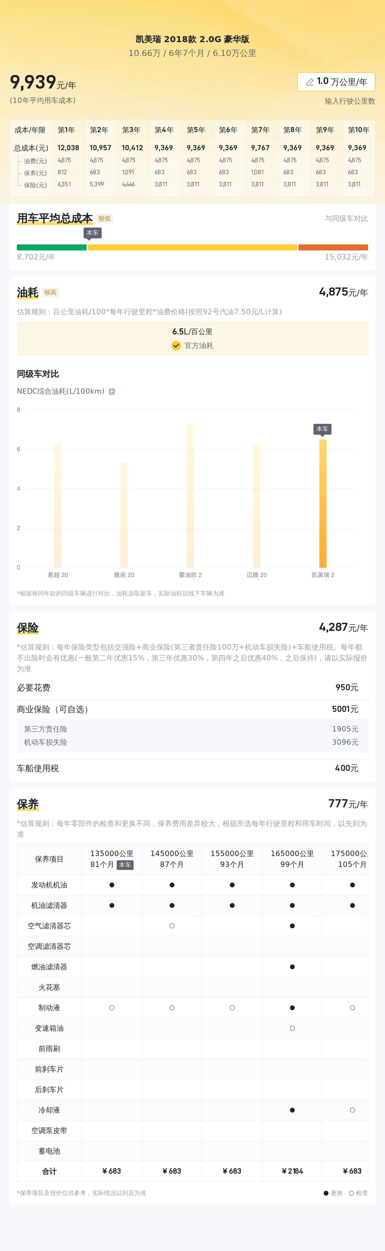 接下来,我们再来看看这款车的市场行情和用车成本。根据懂车帝大数据分析,该车热度较高,预计未来三年内价格相对稳定。这个价格在全国市场来看处于较低的价格,车辆使用8个月,少于平均车龄1.1年,里程6.1万公里,少于均值2.0万公里,过户次数0次,少于均值0.6次,颜色为黑色,10.66万的价格确实超值了。这款凯美瑞 2018款 2.0G 豪华版车型,百公里油耗大约为6.5升,燃油经济性表现相当出色。按照一年行驶2万公里计算,每年的油费大约为5673元。此外,保险费用也是用车成本中不可忽视的一部分。预估每年保险费用约为4295元,这笔开支也需要纳入用车成本的考虑之中。除了油费和保险费用外,车辆保养也是用车成本中重要的一部分。预估每年保养费用约为1148元,这也是保证车辆良好状态所必需的开支。总体来看,这款凯美瑞 2018款 2.0G 豪华版车型的用车成本相对合理,燃油经济性出色,保险和保养费用也在合理范围内。