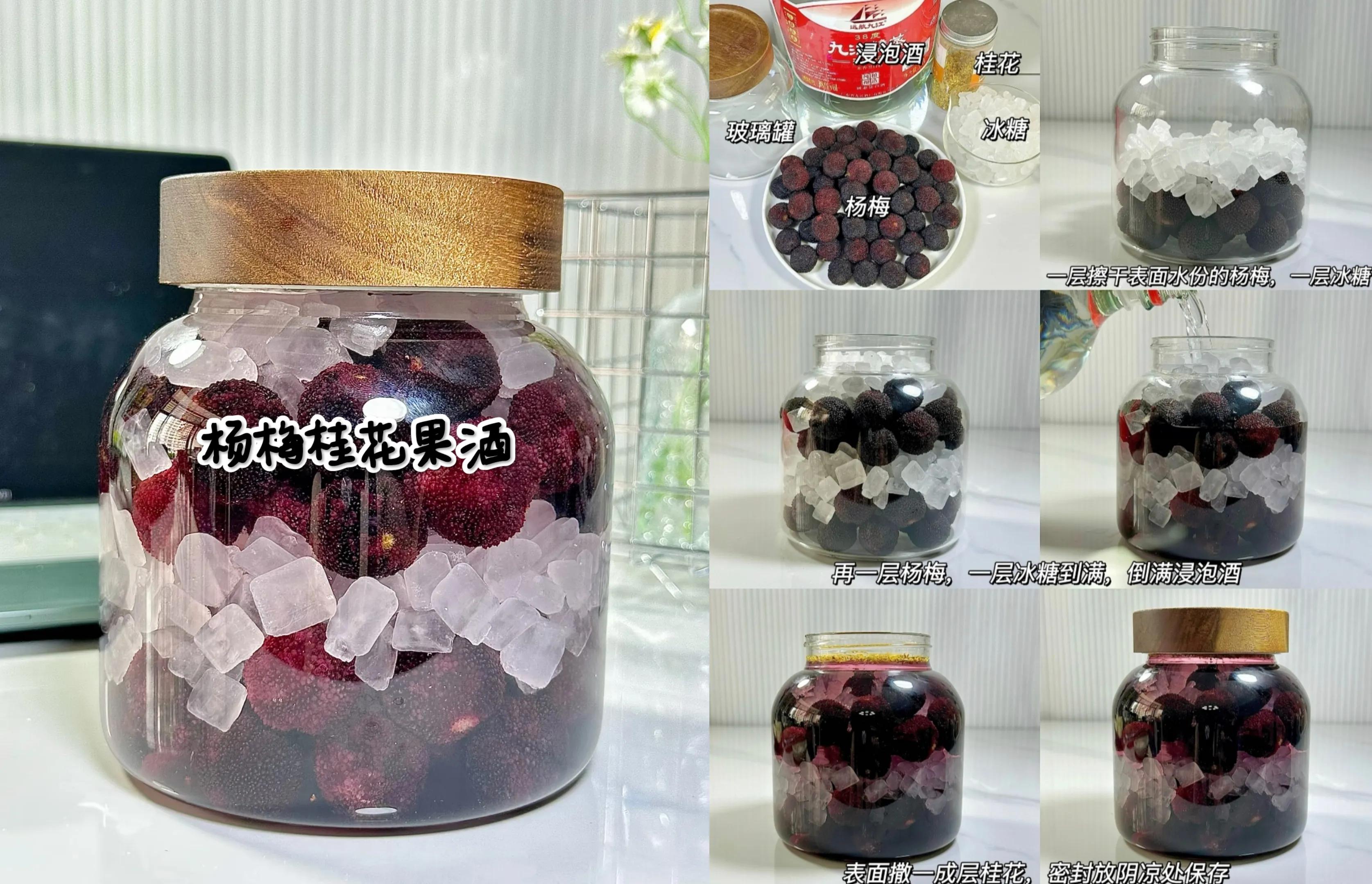 挑选干爽饱满的杨梅,洗净晾干后,与冰糖在密封瓶中层层铺就。倒入浸泡酒没过食材,最后撒上一小把金黄的桂花,轻轻旋紧瓶盖,将这份酸甜与清香封存。在阴凉避光处静静等待,时间会让杨梅释放出浓郁的酸甜滋味,桂花的清香也慢慢渗入酒液。