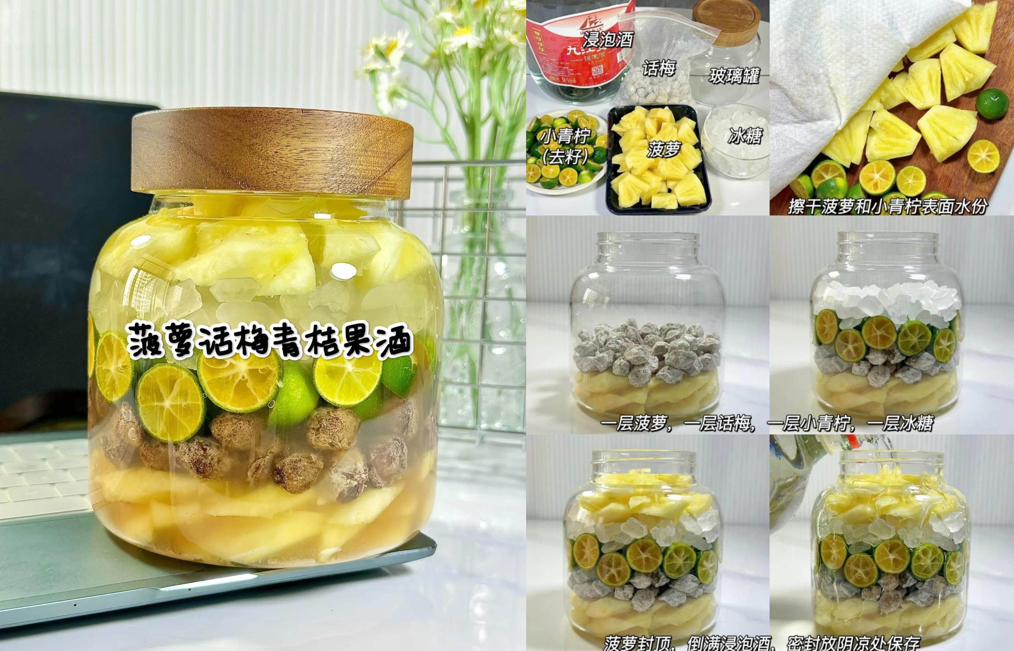 将干爽的菠萝切成小块,与酸甜的话梅、清新的小青柠在密封瓶中分层摆放,最后用几片新鲜菠萝封顶,营造出视觉与味觉的双重享受。撒上冰糖后,倒入浸泡酒,让各种食材在酒液中相互交融。