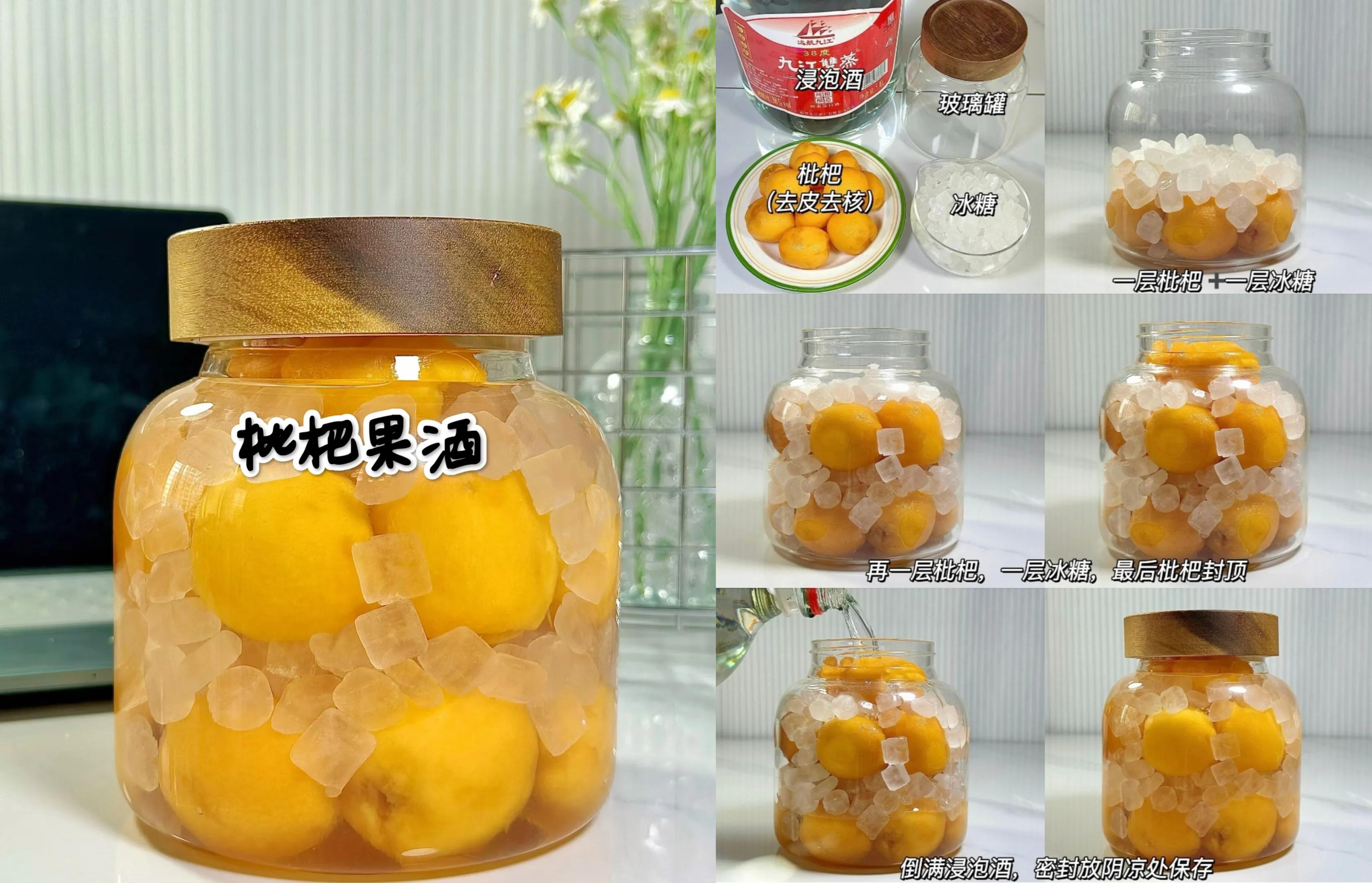 把圆润金黄的枇杷去皮去核,整齐地码放在密封容器中,每一层枇杷都均匀地撒上冰糖。接着倒入浸泡酒,密封好容器,让时间成为最好的酿酒师。随着发酵的进行,枇杷的清甜逐渐融入酒中,酒液慢慢染上诱人的金黄色泽。打开瓶盖,醇厚的果香与酒香扑鼻而来,轻啜一口,口感绵密醇厚,满满的都是枇杷果实的甜蜜馈赠。