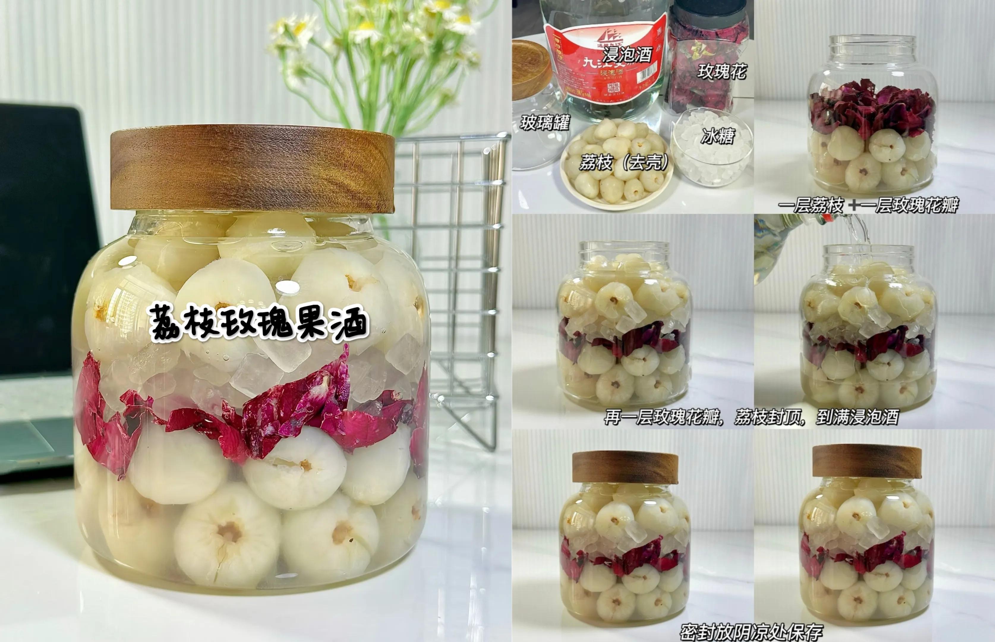 将颗颗饱满的新鲜荔枝剥壳去核,与娇艳欲滴的玫瑰花瓣层层交错,放入干净的密封瓶中。撒上晶莹剔透的冰糖,缓缓倒入浸泡酒,让酒液漫过所有食材。轻轻摇晃瓶身,看着荔枝与玫瑰在酒中舒展,仿佛封存了整个春天的浪漫。