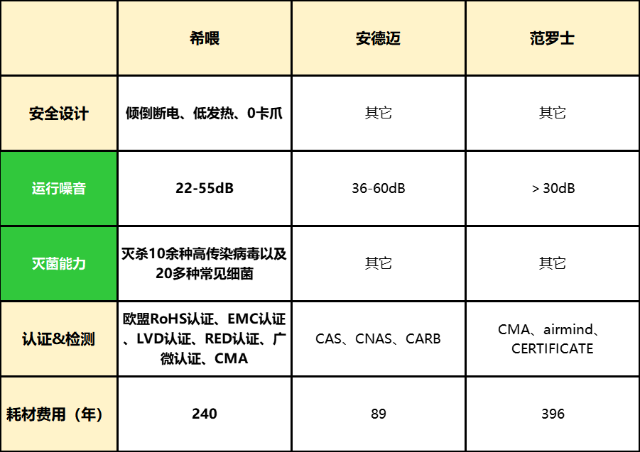 与此相比,范罗士和安德迈虽然采用了初效滤网设计,但由于没有光触媒技术,其对异味的长期净化能力较差。