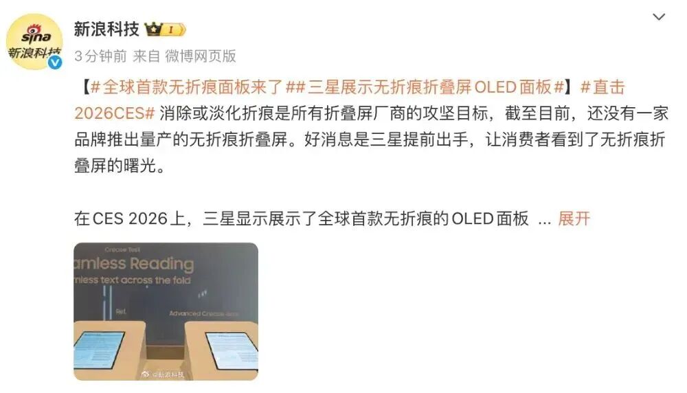 另外,参考新浪科技的报道来看,三星显示在CES 2026上展示了全球首款无折痕的OLED面板,消息称这块屏幕将由自家的Galaxy Z Fold8首发搭载,苹果首款折叠屏iPhone Fold也可能使用这块屏幕。