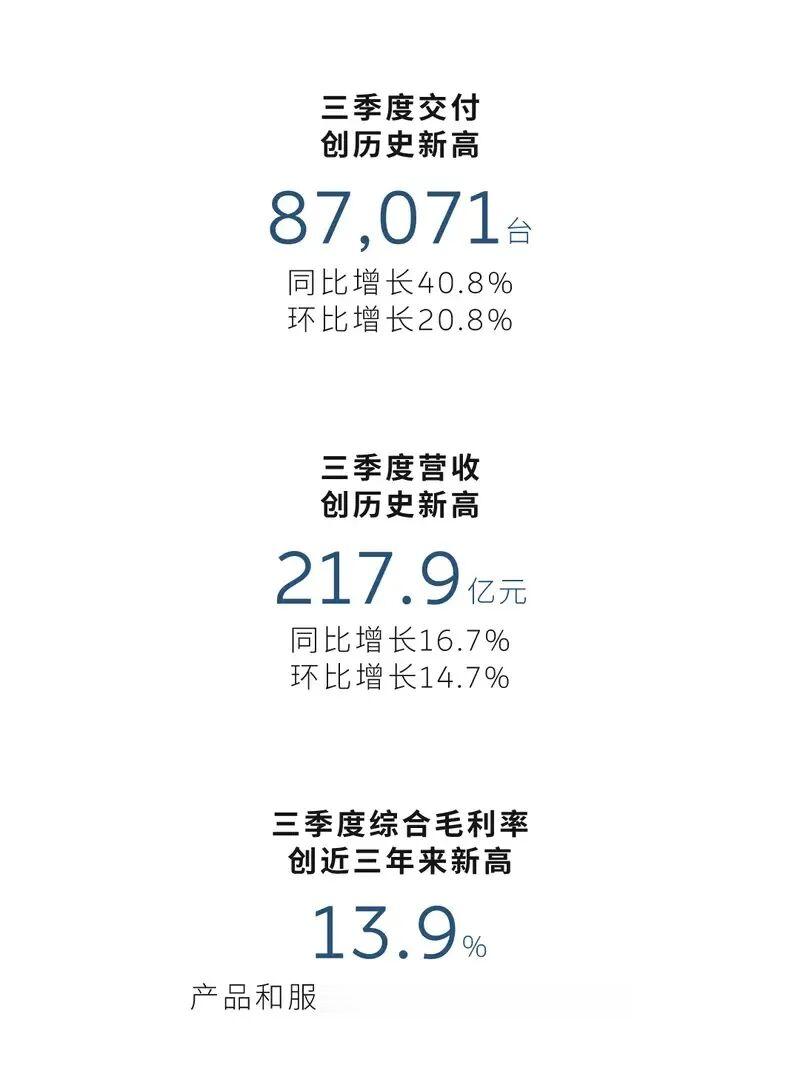 三季度营收217.9亿元,同比增长16.7%,环比增长14.7%,创历史新高。三季度综合毛利率13.9%,创近三年来新高,产品和服务盈利能力显著增强。三季度整车毛利率14.7%,创近三年新高。三季度现金储备367亿元,环比大幅增长近百亿,实现正向经营性现金流和自由现金流。四季度交付指引120,000台至125,000台,同比增长65.1%至72.0%,创历史新高。营收指引327.6亿元至340.4亿元,同比增长66.3%至72.8%,创历史新高。