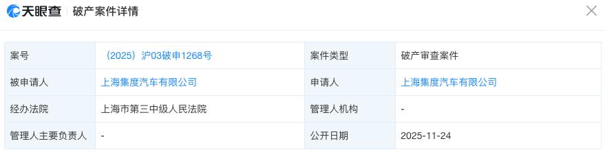 11月24日,天眼查信息显示,上海集度汽车有限公司新增一则破产审查案件,申请人与被申请人均为上海集度汽车有限公司,经办法院为上海市第三中级人民法院。